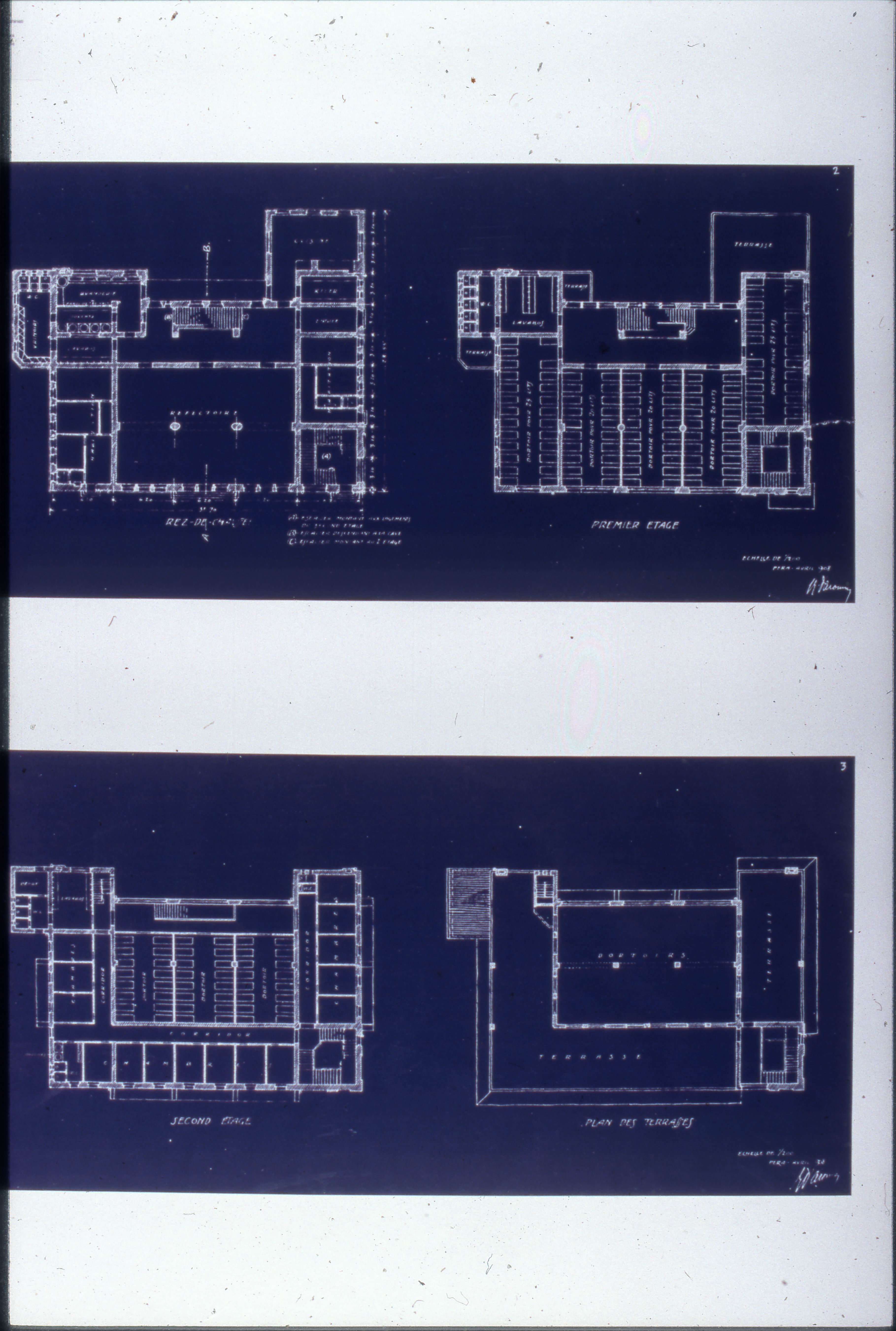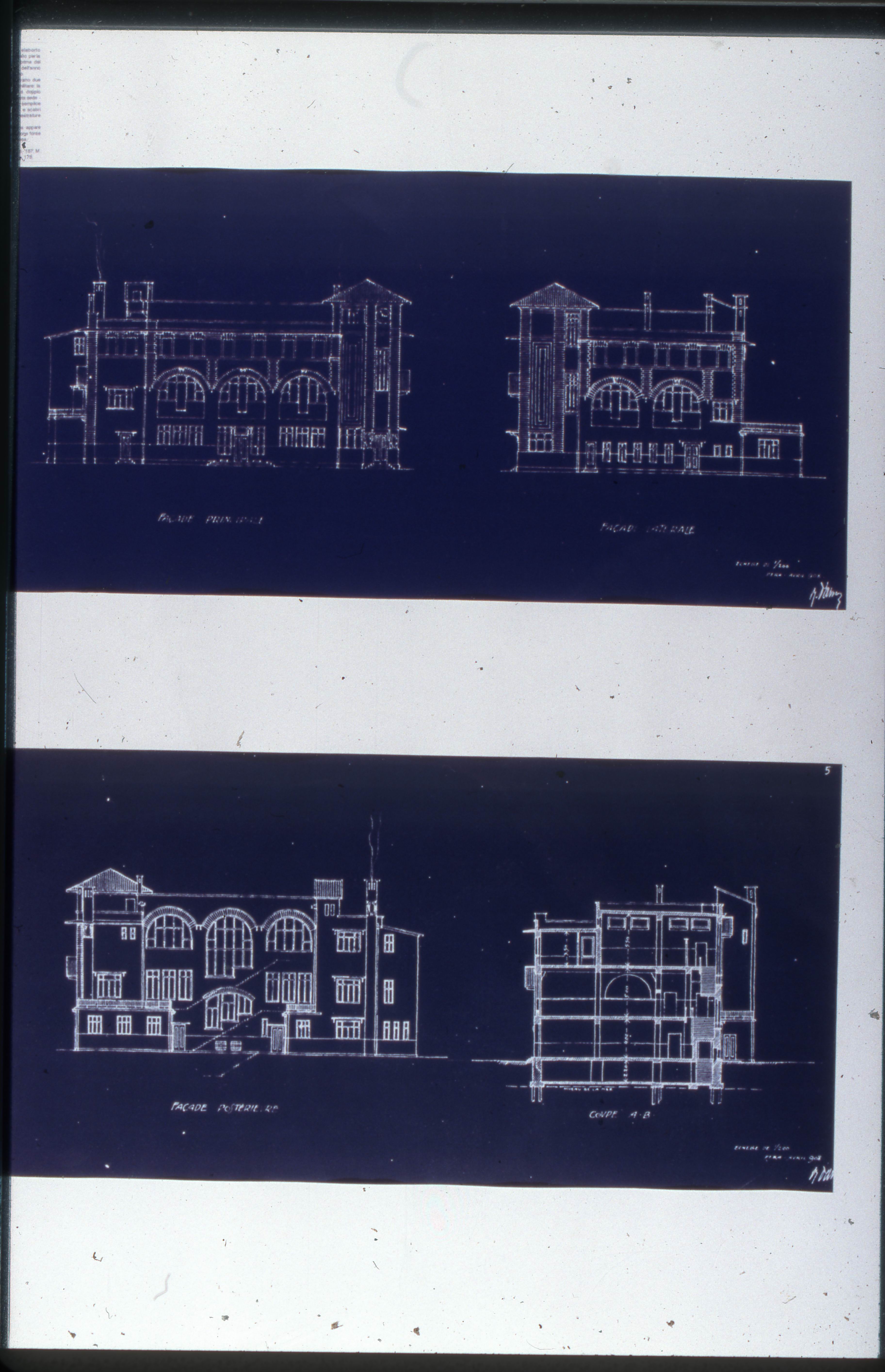 Facade views and floor plans of the porters' barracks and machinist lodges