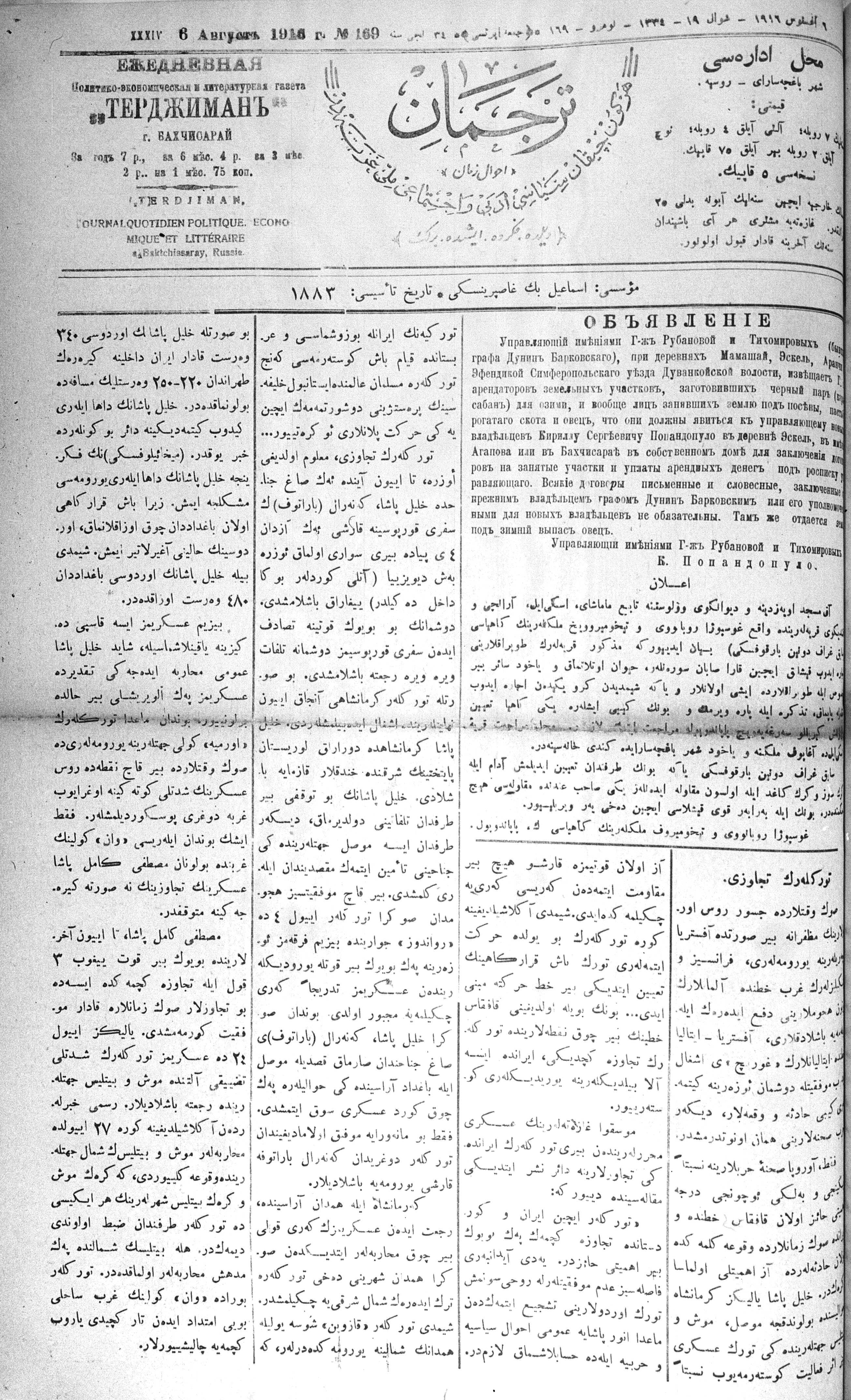 Tercüman, 06 August 1916 Year 34 No 169