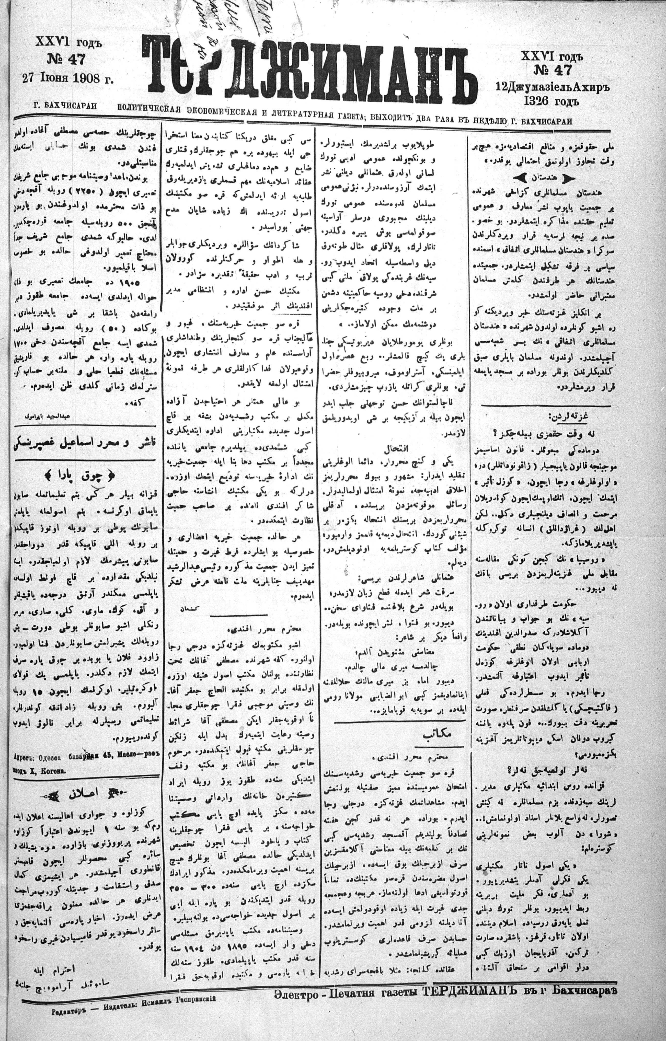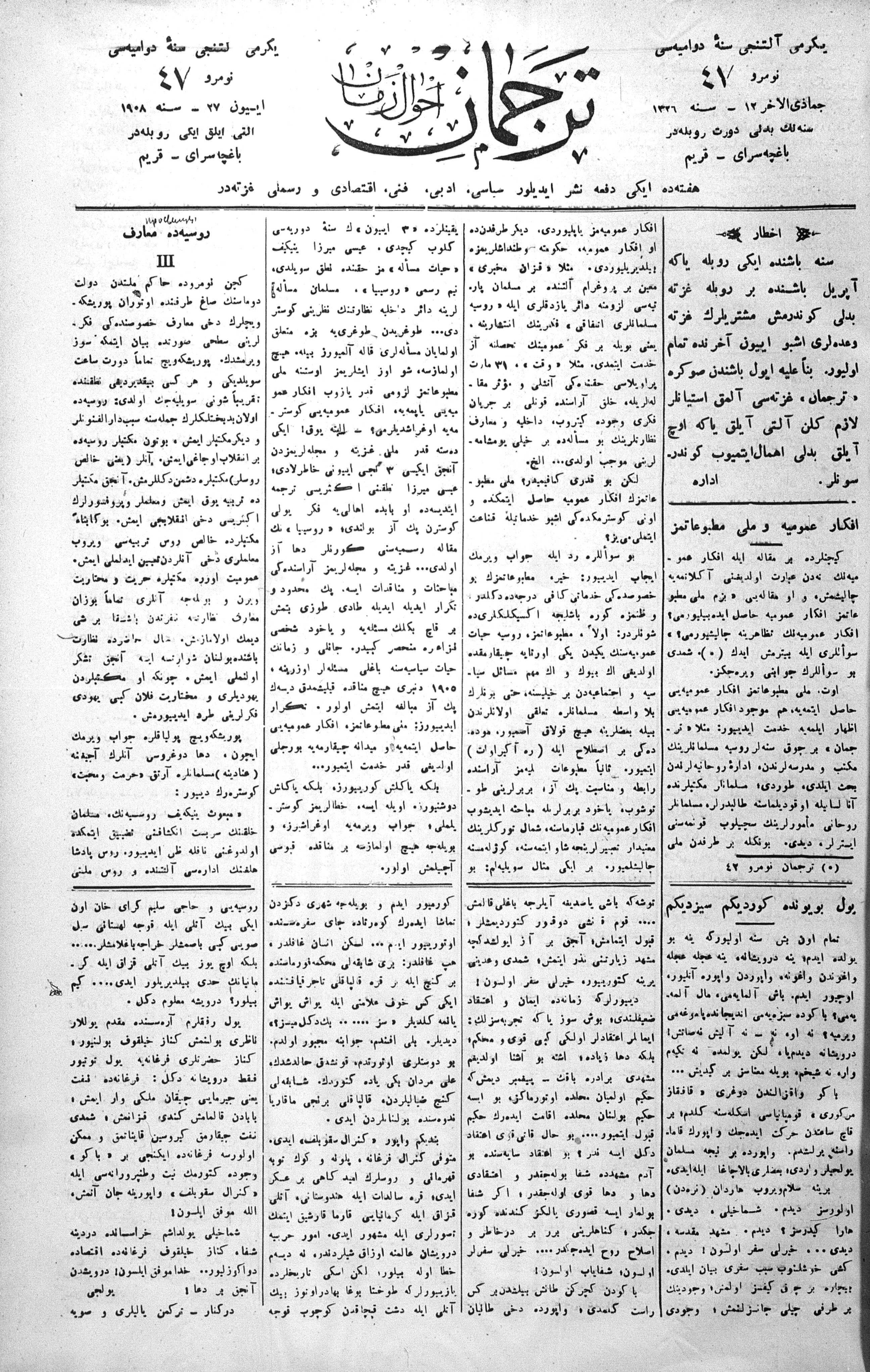 Tercüman, 27 June 1908 Year 26 No 47
