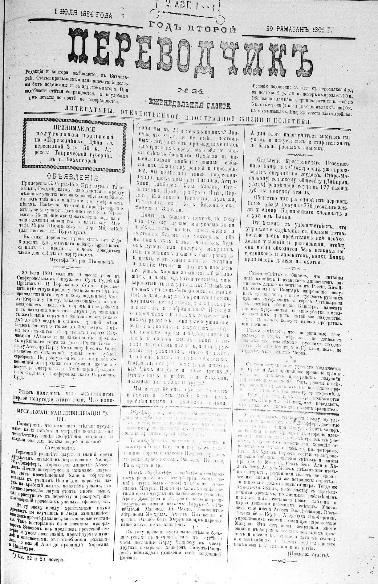 Tercüman, 01 July 1884 Year 2 No 24