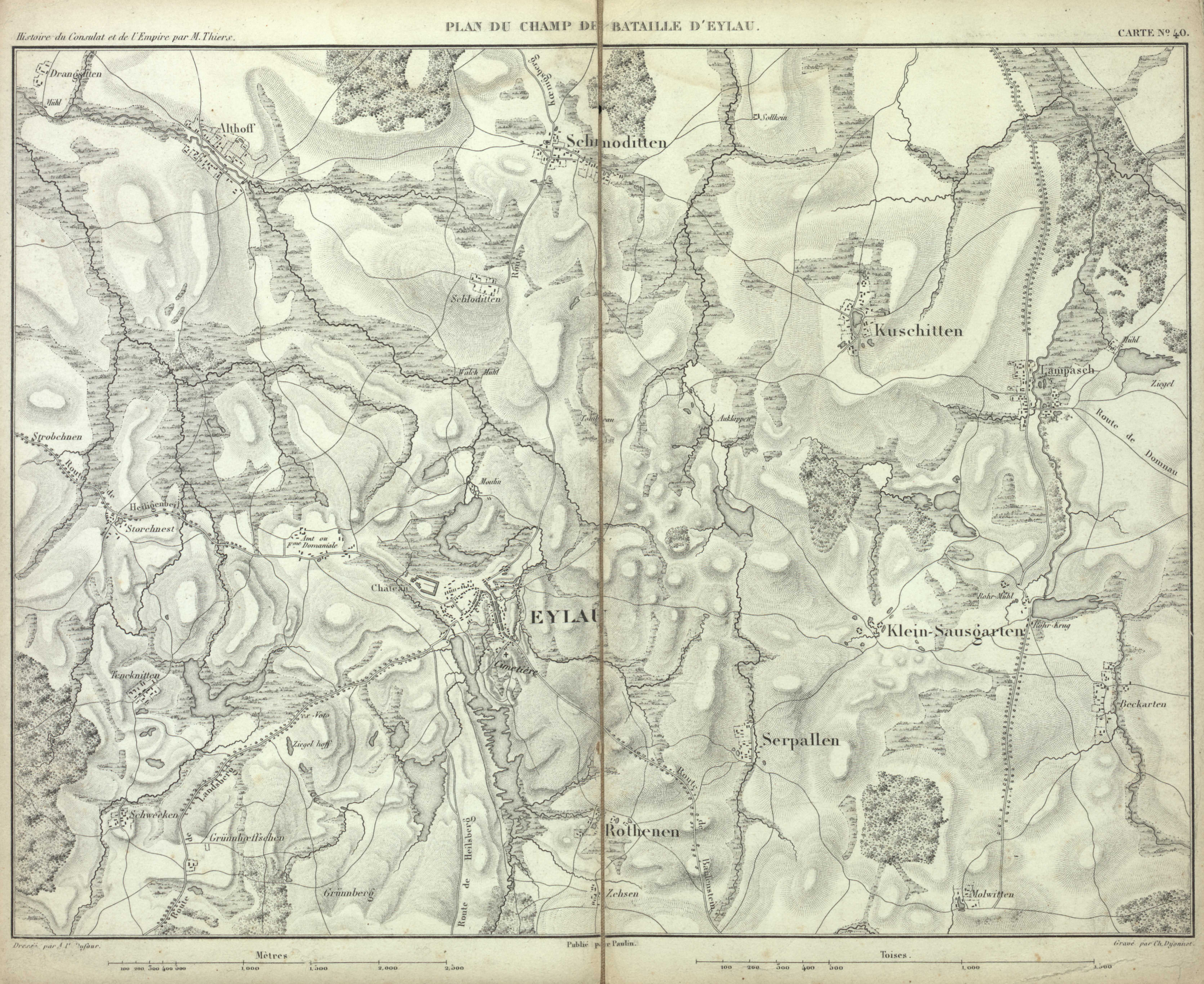 Map of battlefield of Eylau (ancient Prussian now Russia). 7th and 8 th February 1807. Belligerents: French Empire and Russian Empire. It was a part of the War of the Fourth Coalition, in the context of Napoleonic Wars.