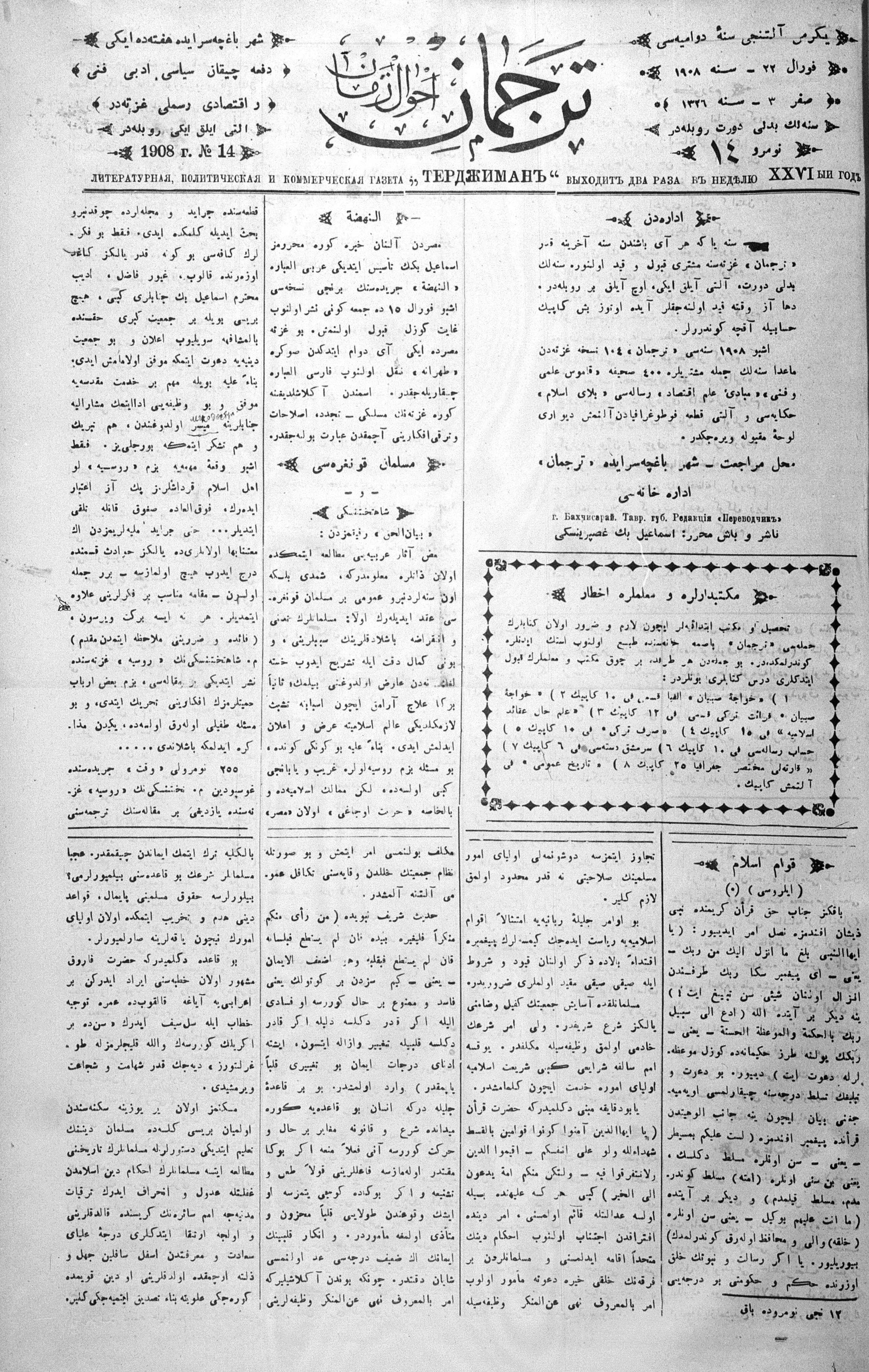 Turkish-Russian newspaper published in Crimea by İsmail Gaspıralı.