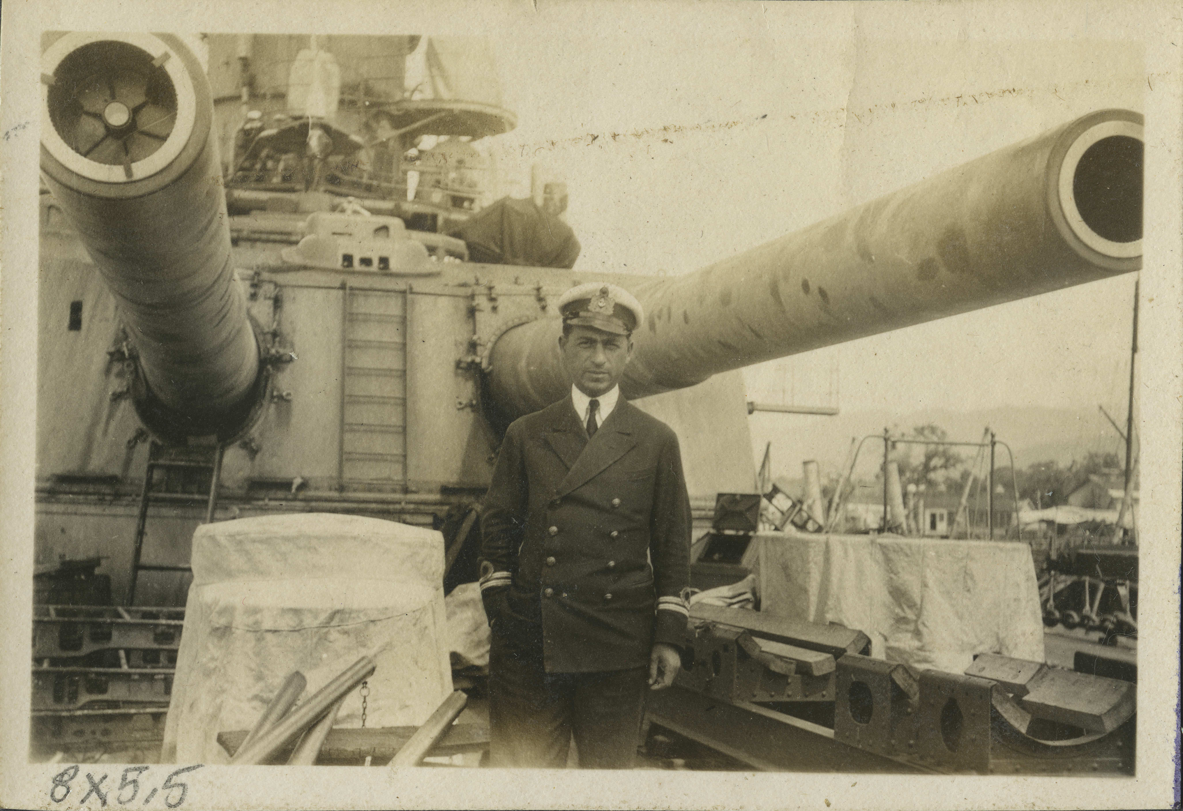 Türk donanma gemilerinden birinin güvertesinde topların önünde bir bahriye subayının çektirdiği fotoğraf