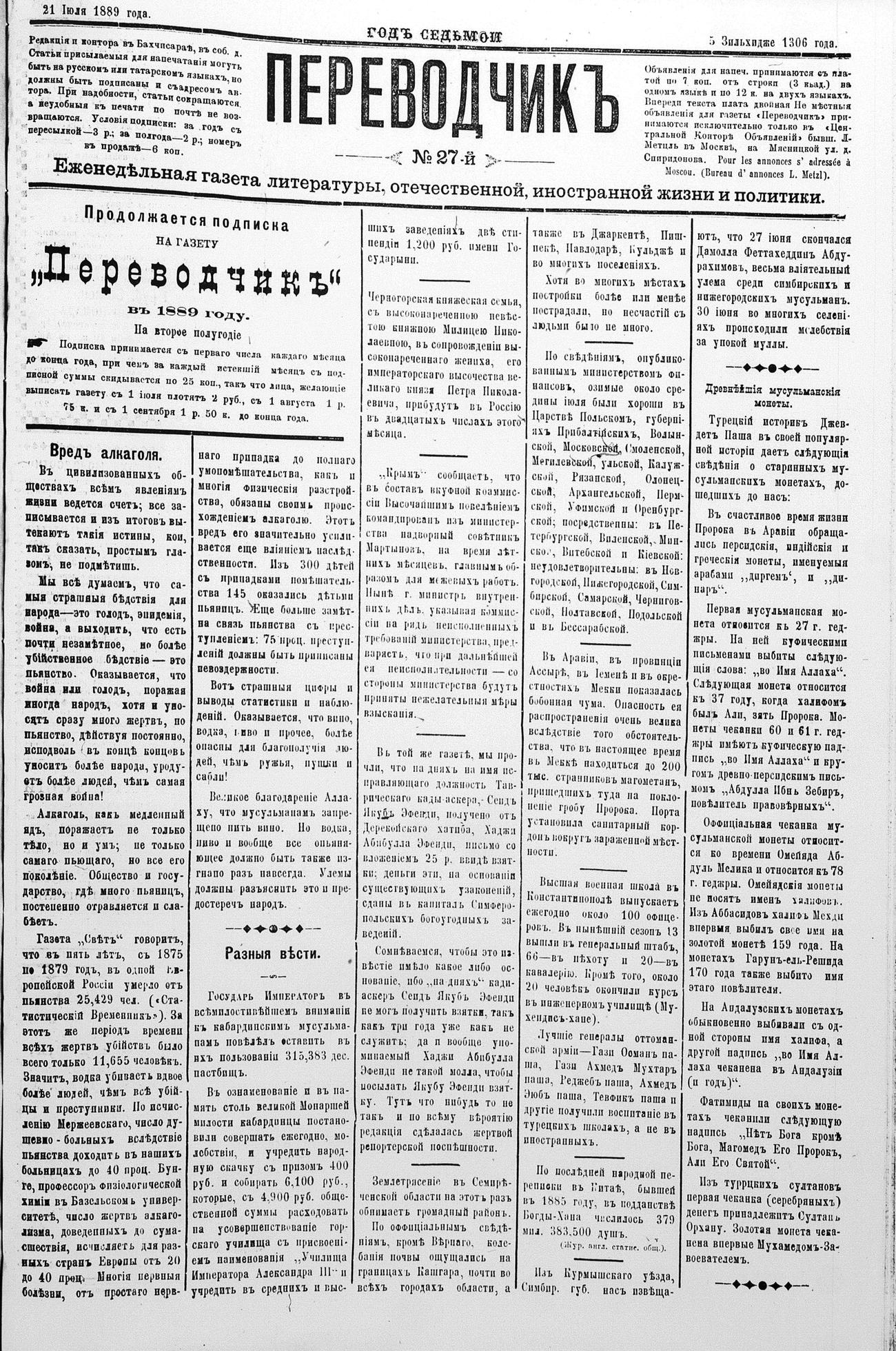 Tercüman, 21 July 1889 Year 7 No 27