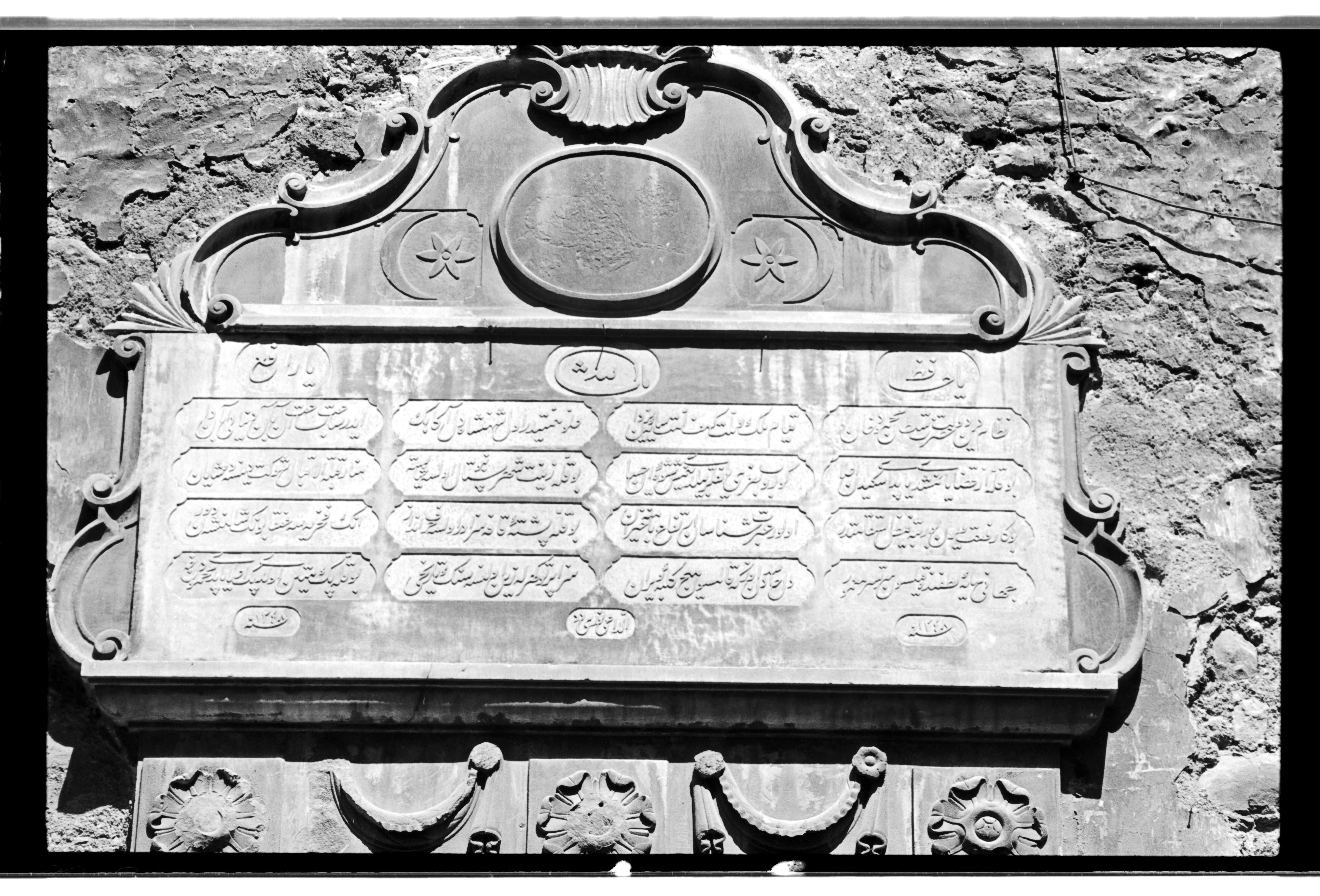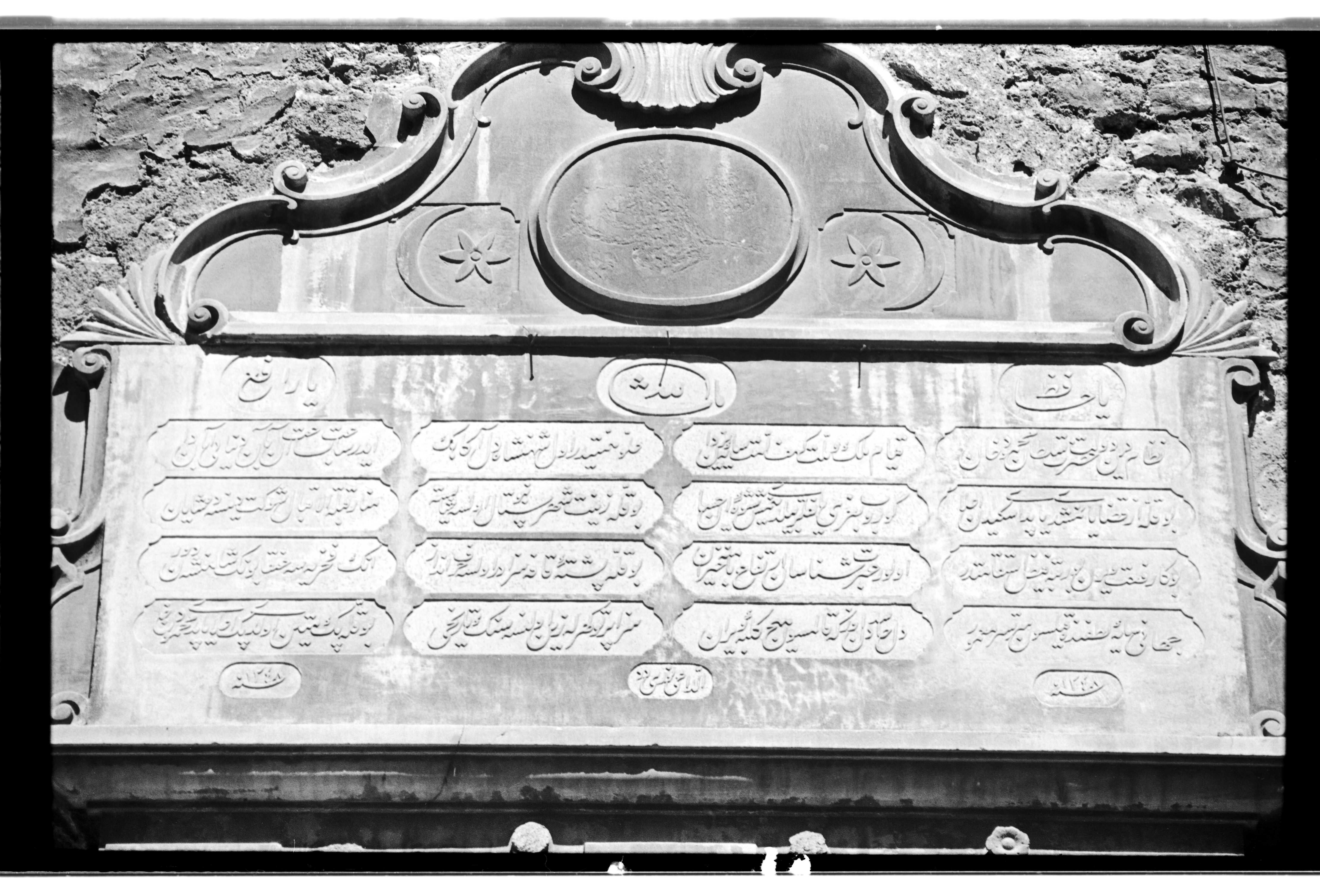 Text on the inscription: Niẓām-ı dīn [ü] devlet Ḥażret-i Sulṭān Maḥmūd Ḫān Ḳıyām-ı mülk ü millet kehf-i ümmet sāye-i Yezdān ‘Ulüvv-i himmetidir ol şehinşāh-ı dil-āgāhıŋ Eder sa‘āt-be-sa‘āt ān-be-ān dünyāyı ābādān Bu ḳulle ez-ḳażā yanmışdı yaptı eskiden a‘lā Görüp baġrı yanıḳlar bildi neymiş şīve-i iḥsān Bu ḳulle zīnet-i şehr-i Sitanbul olsa şāyeste Menār-ı ḳıbletü’l-iḳbāl [ü] şevket dense de şāyān Buŋa rif‘at veren bu rütbe feyż-i istiḳāmetdir Olur ‘ibret-şināsān irtifā‘-ı bāmına ḥayrān Bu ḳulle püşte-i Ḳāf’a sezādır olsa ḥarf-endāz Anıŋ faḫriyyesi ‘Anḳā bunuŋ şāhenşeh-i devrān Cihānı sāye-i luṭfunda ḳılsın ser-te-ser ma‘mūr Dil-i ḥāsidden özge ḳalmasın hīç külbe-i vīrān Sezā Pertev güherle zeyn olunsa seng-i tārīḫi Bu ḳulle pek metīn oldu pek a‘lā yaptı Maḥmūd Ḫān Sene 1248 ed-dā’ī Nūrī Dede (http://www.ottomaninscriptions.com/verse.aspx?ref=list&bid=1257&hid=1579)