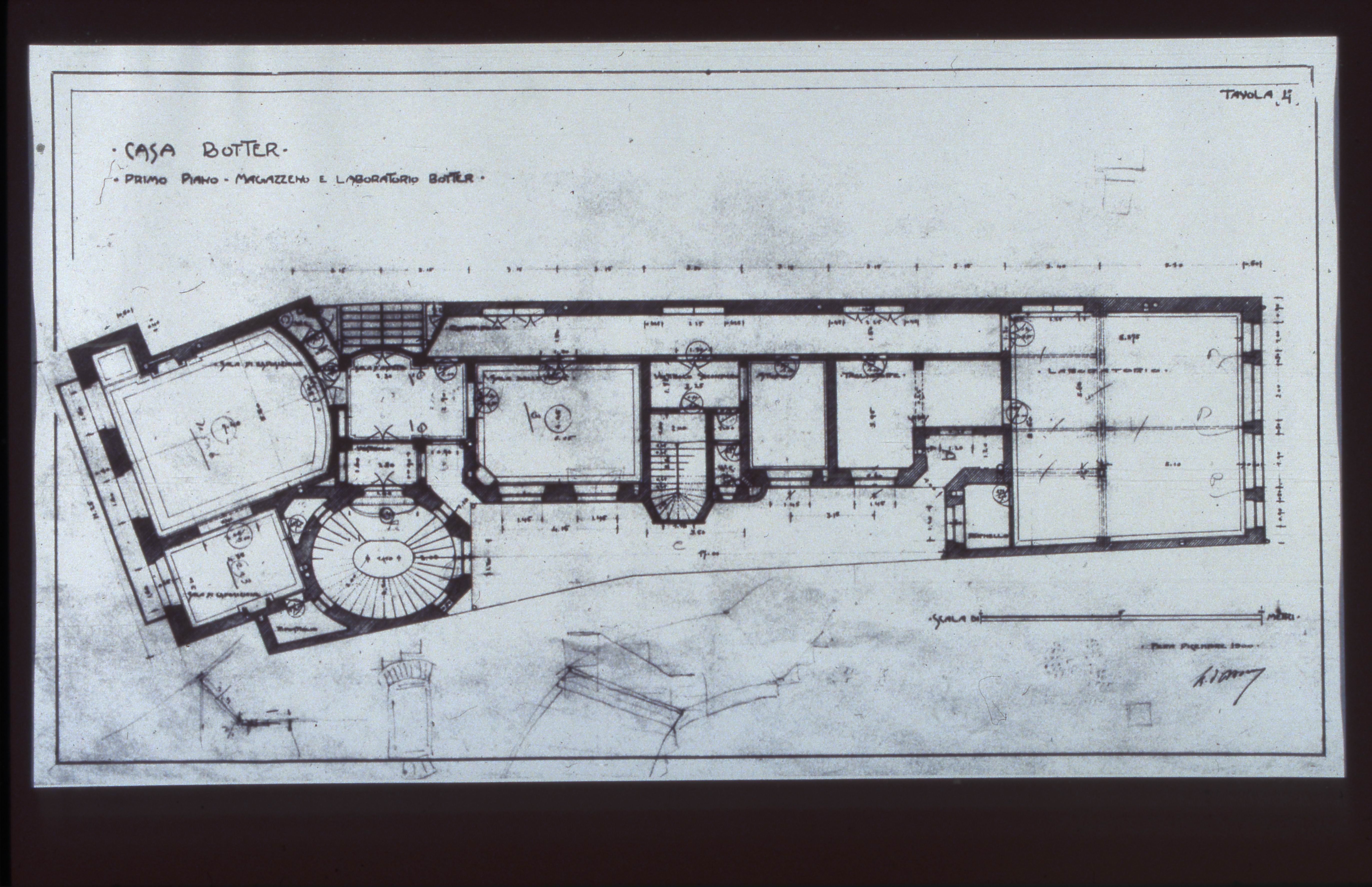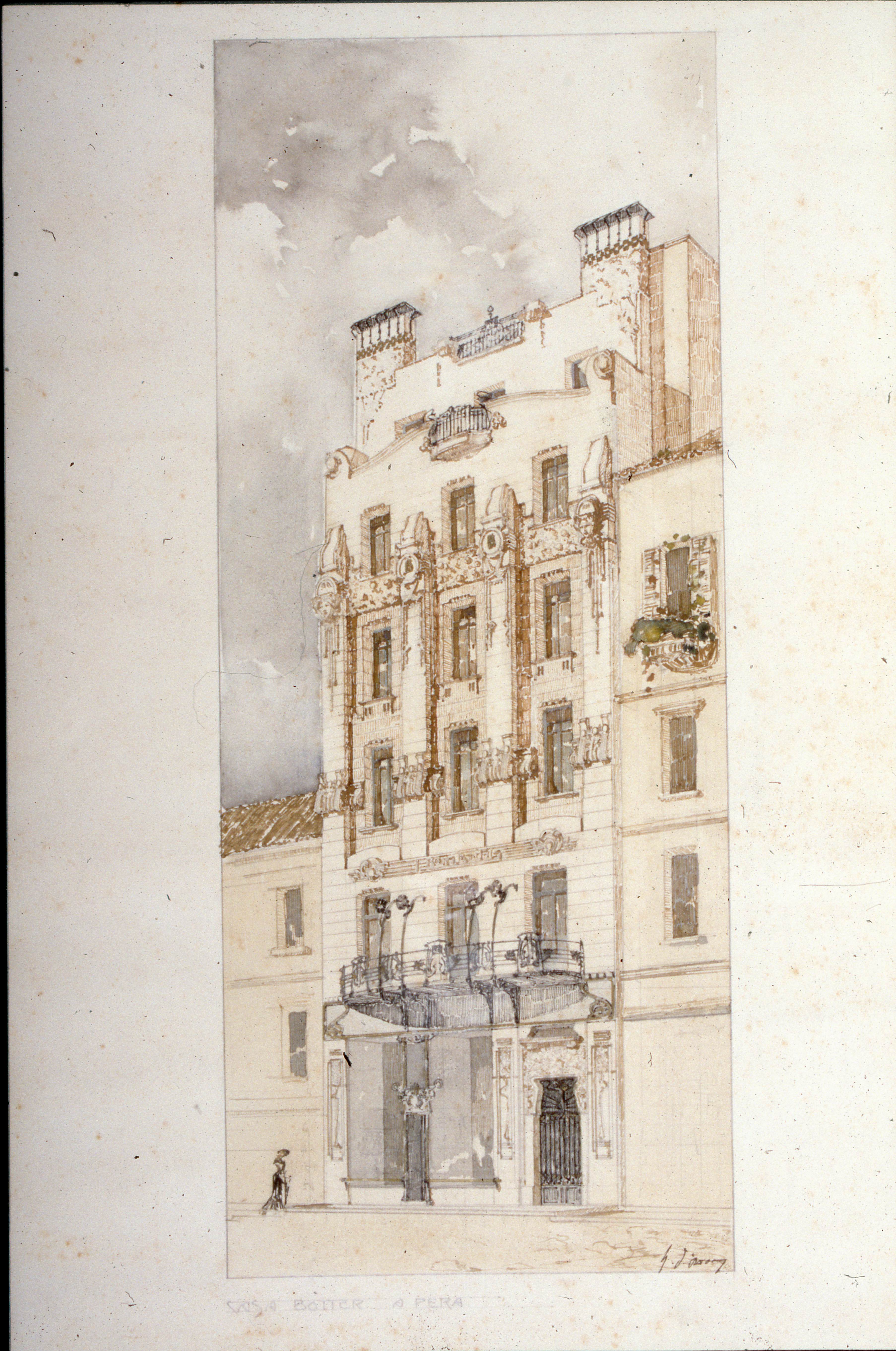 Facade view and plan of Botter Apartment on İstiklal Street drawn by Raimondo D'Aronco