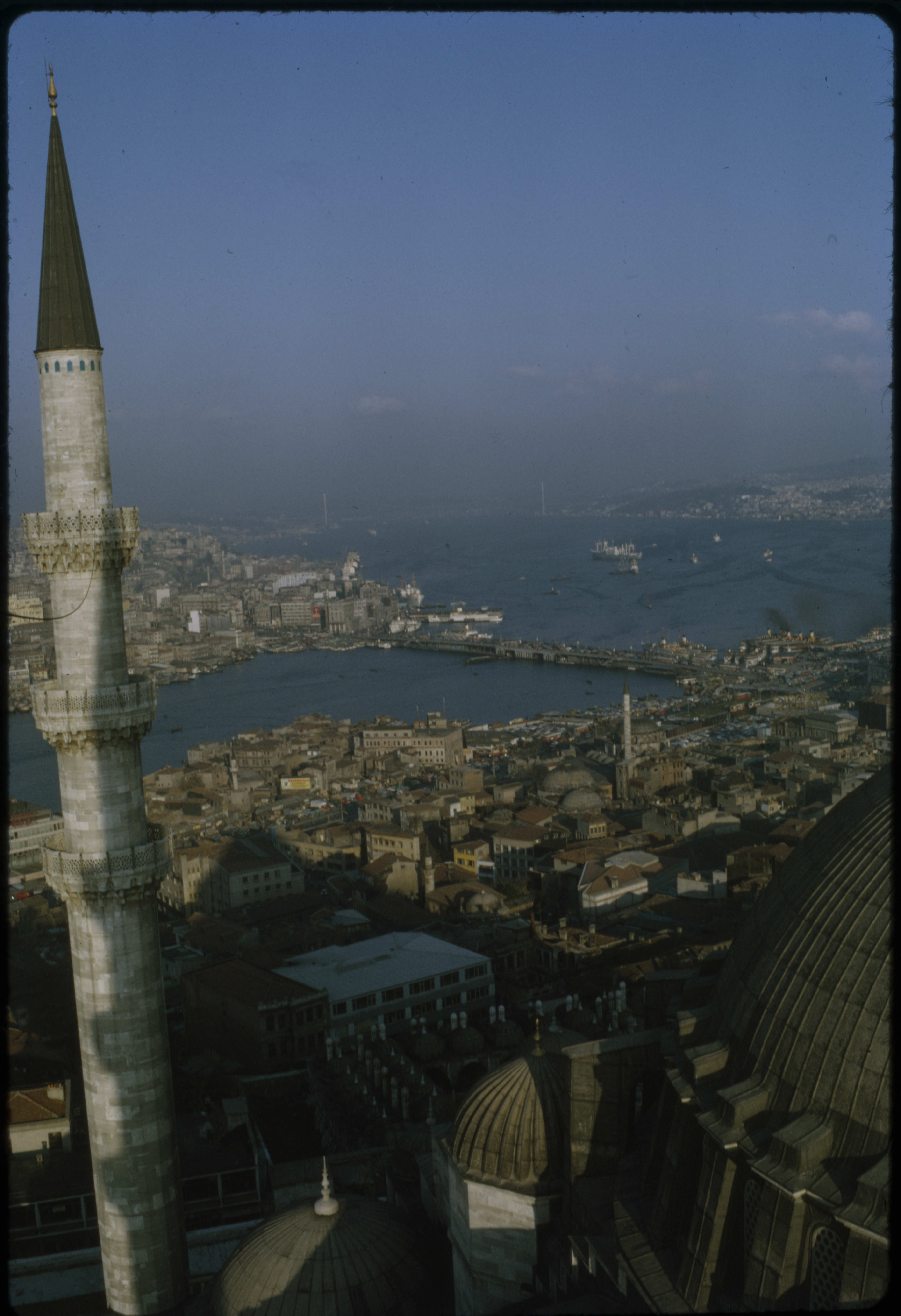 İstanbul-Süleymaniye Camii minarelerinden Rüstem Paşa Camii, Galata Köprüsü, Karaköy ve Boğaziçi Köprüsü'nün görünüşü