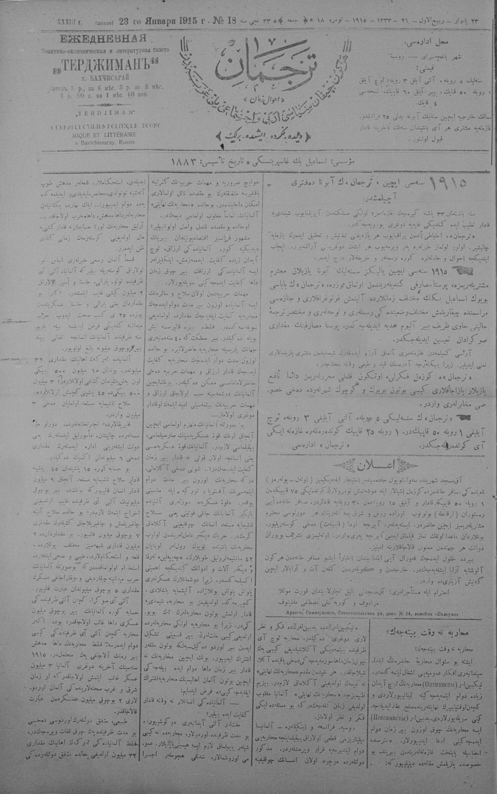 Tercüman, 23 January 1915 Year 33 No 18