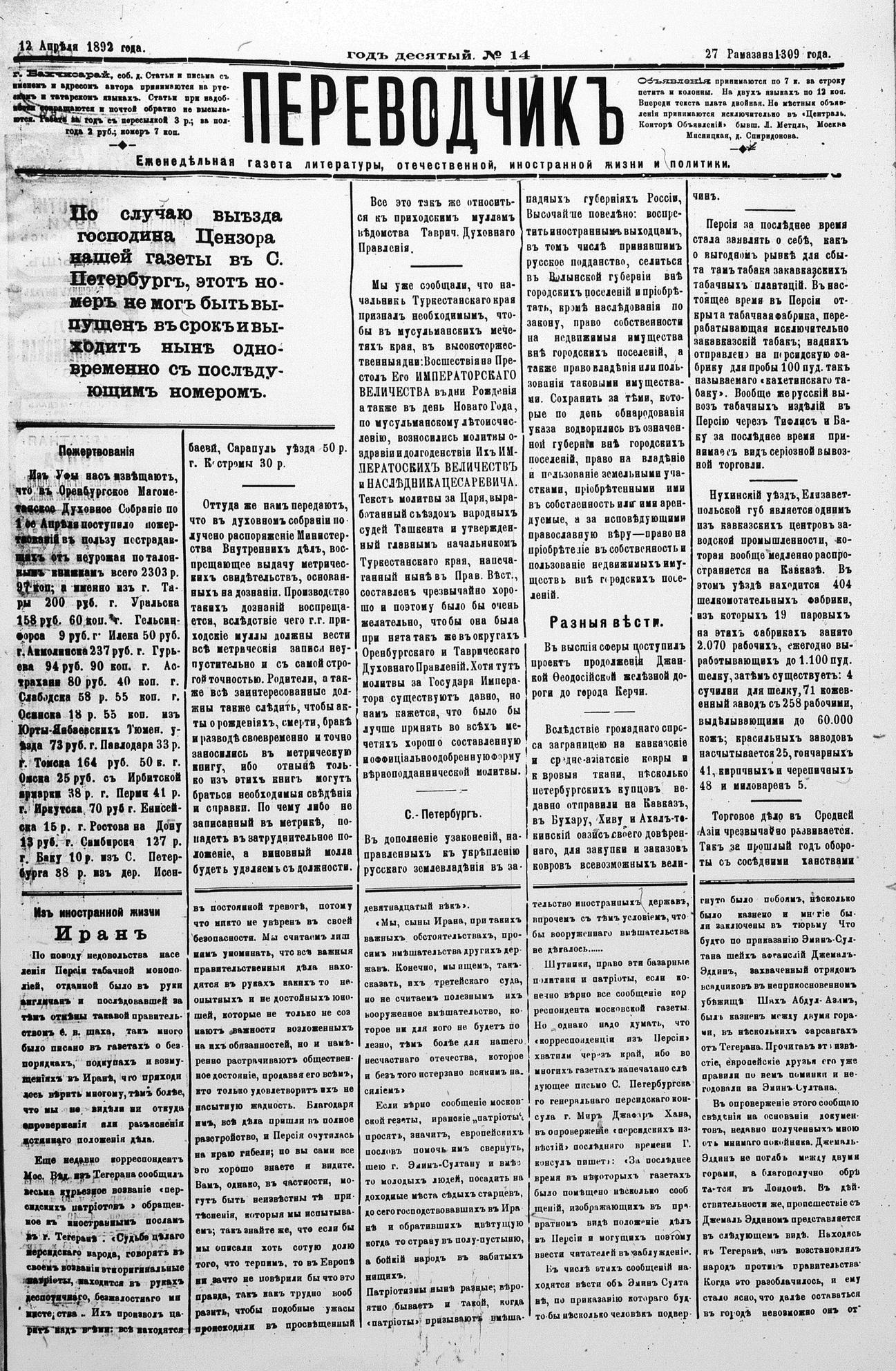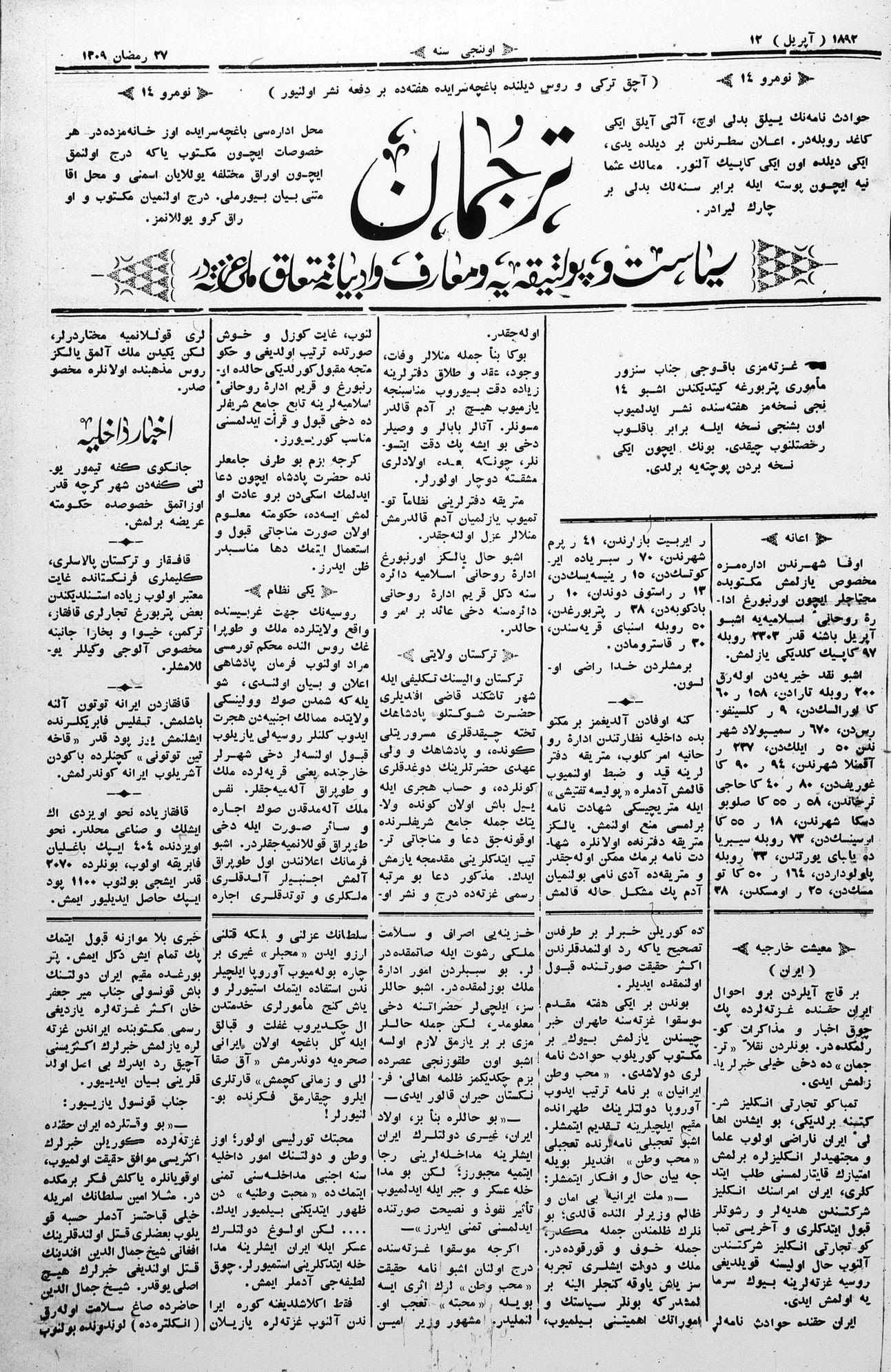 Tercüman, 12 April 1892 Year 10 No 14
