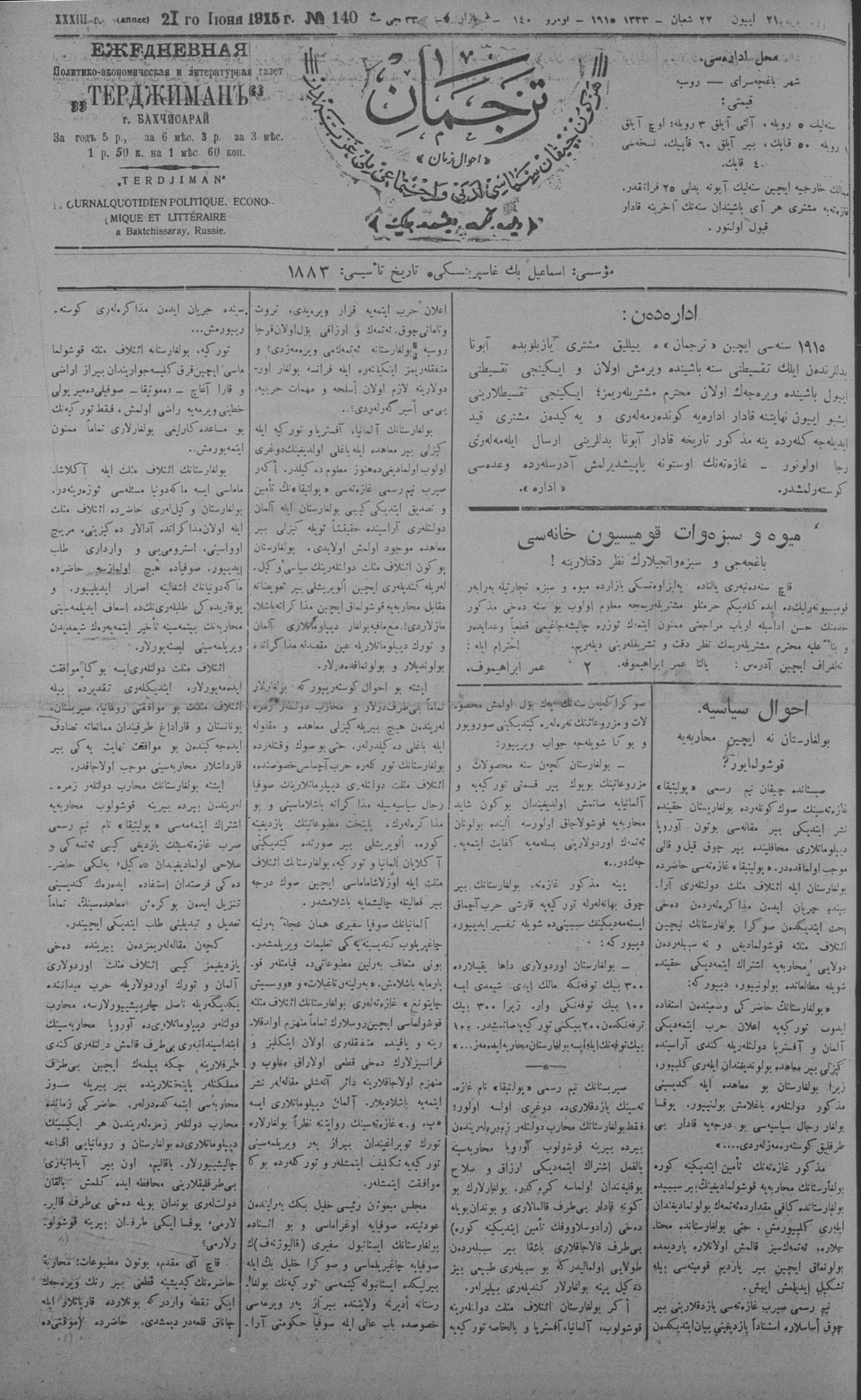 Tercüman, 21 June 1915 Year 33 No 140
