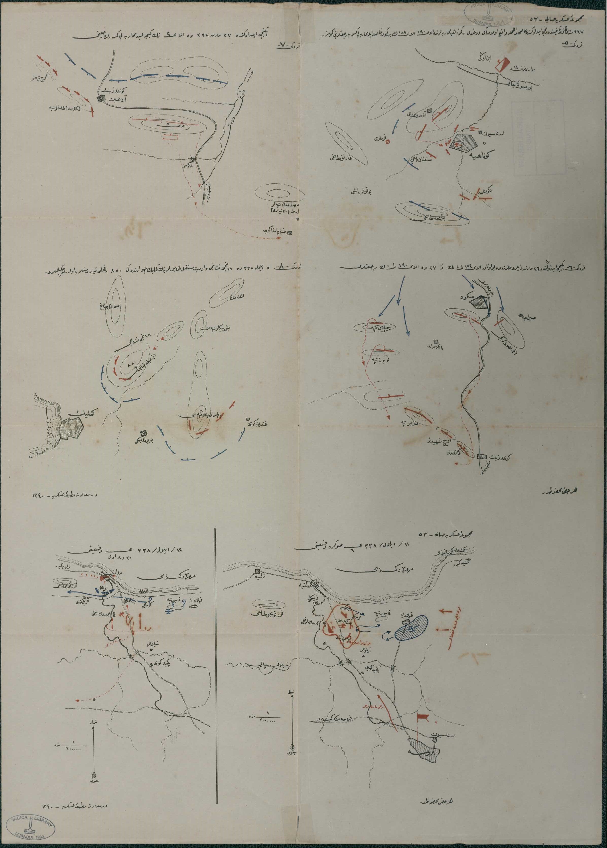 With: Kroki-5: 337 Senesi Kanun-ı sanisinde Birinci İnönü’nde âsi vâhimle vaki olan Aydoğdu, Kütahya Muharebelerinde 190. Alay 189. Alayın birer gün fasıla ile muharebeyi kesip ricatlerini gösterir.- Kroki-6: İkinci İnönü’nde 26 Mart’ta ileri müfrezede bulunan 134. Alay 2. Taburun ve 27’de [Martta] 190. Alay 1. Taburun ricatleri.- Kroki-7: İkinci İnönünde 27 Mart 337’de 2. Alayın geceleyin muharebeyi keserek ricati.-Kroki-8: 5 Eylül 338’de 18. Nişancı ve İzmit muttasıl taburlarının Gemlik civarındaki 850 rakımlı tepeden mağlup olarak çekilmeleri.- Kroki: 11 Eylül 338 saat 6 sonra vaziyeti.- Kroki: 12 Eylül 338 saat 8:30 evvel vaziyeti.