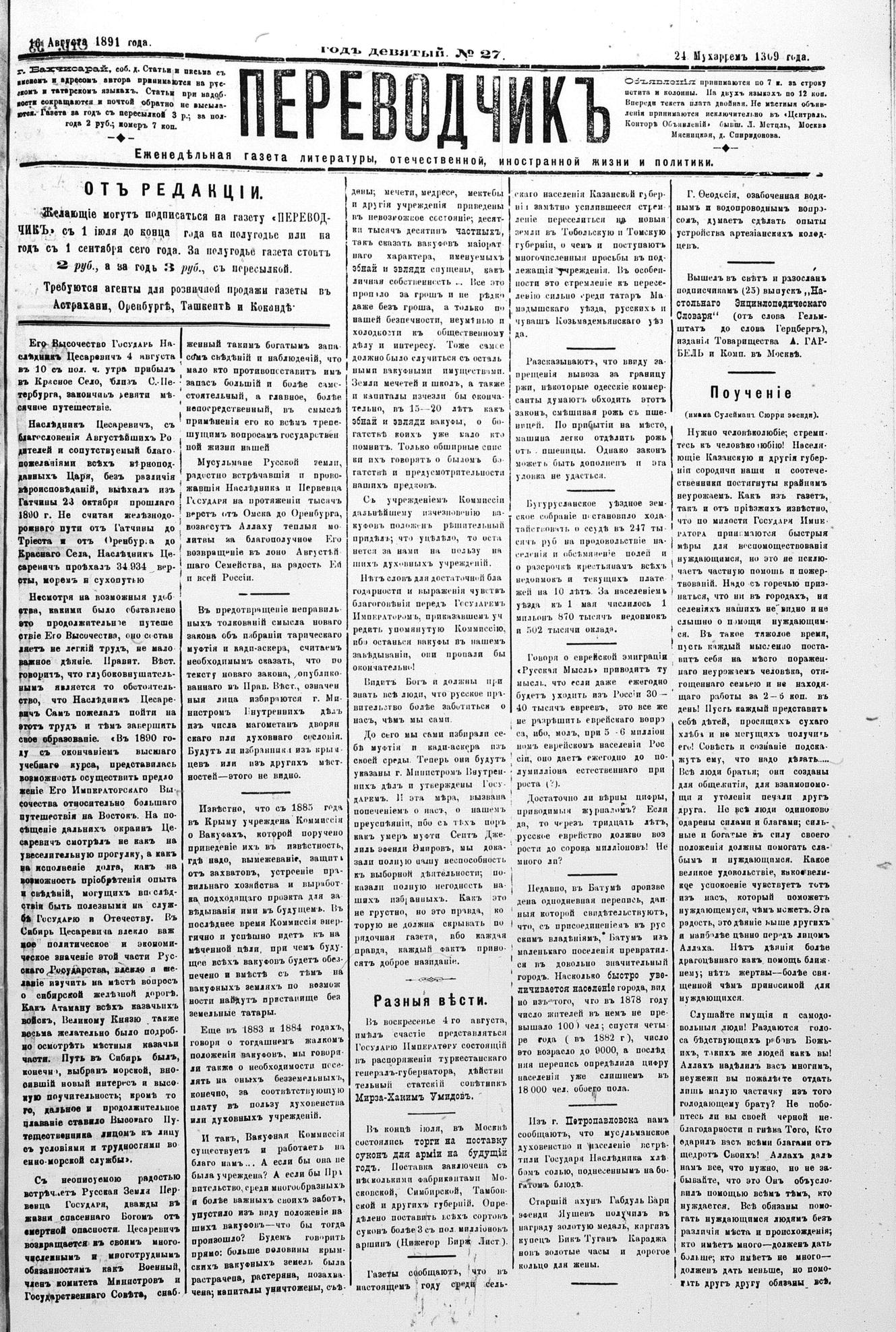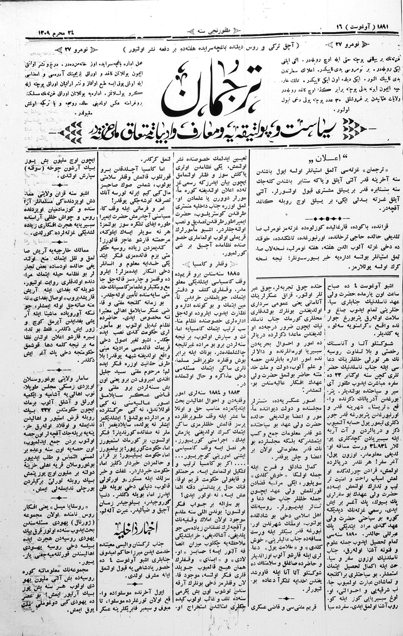 Tercüman, 16 August 1891 Year 9 No 27
