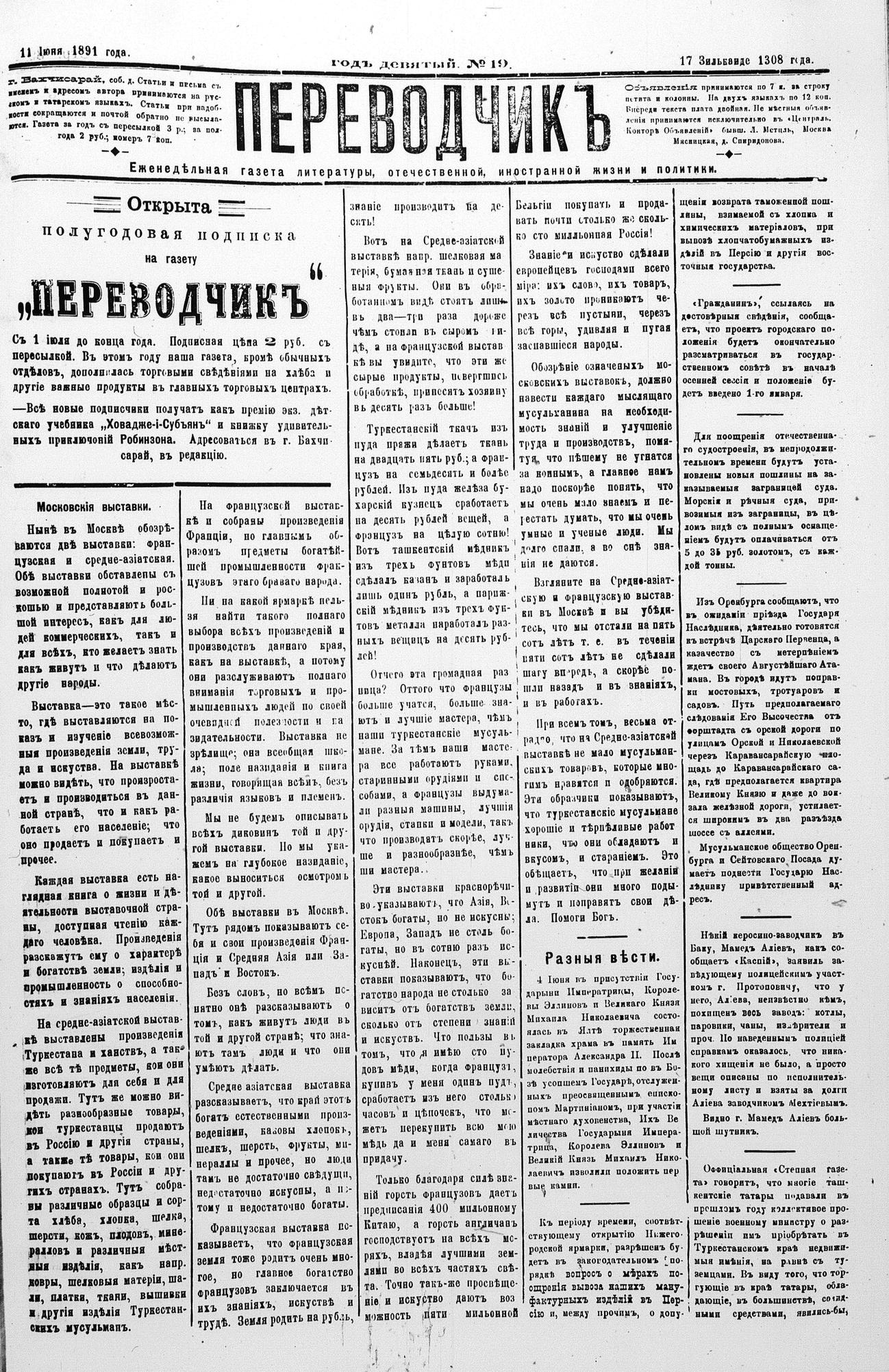 Turkish-Russian newspaper published in Crimea by İsmail Gaspıralı.