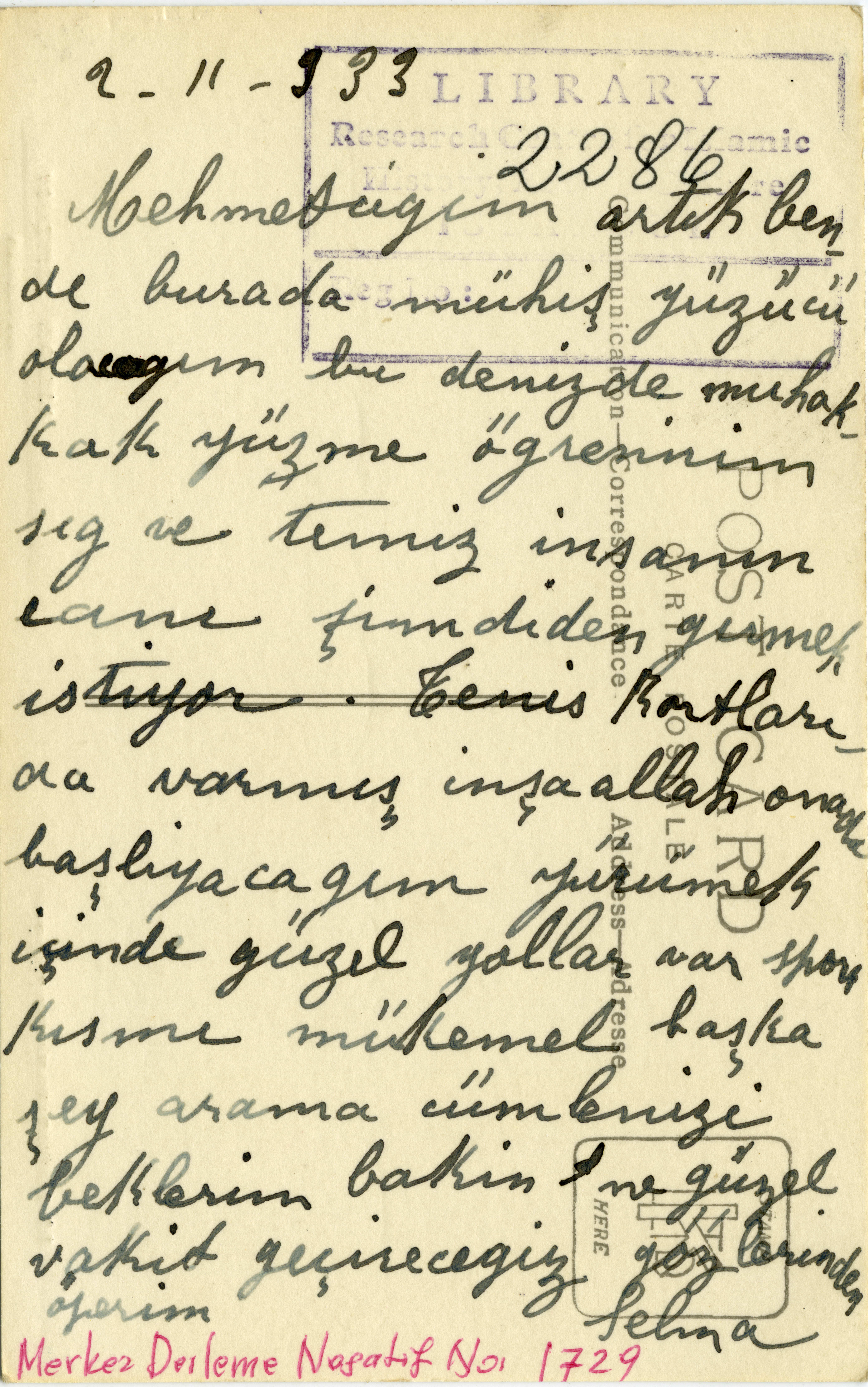 A postcard sent by Selma in 02.11.1933 mentioning that she would be a fantastic swimmer here, that she could learn to swim because the sea was shallow and clean, that there were beautiful paths for walking, and sending her greetings.