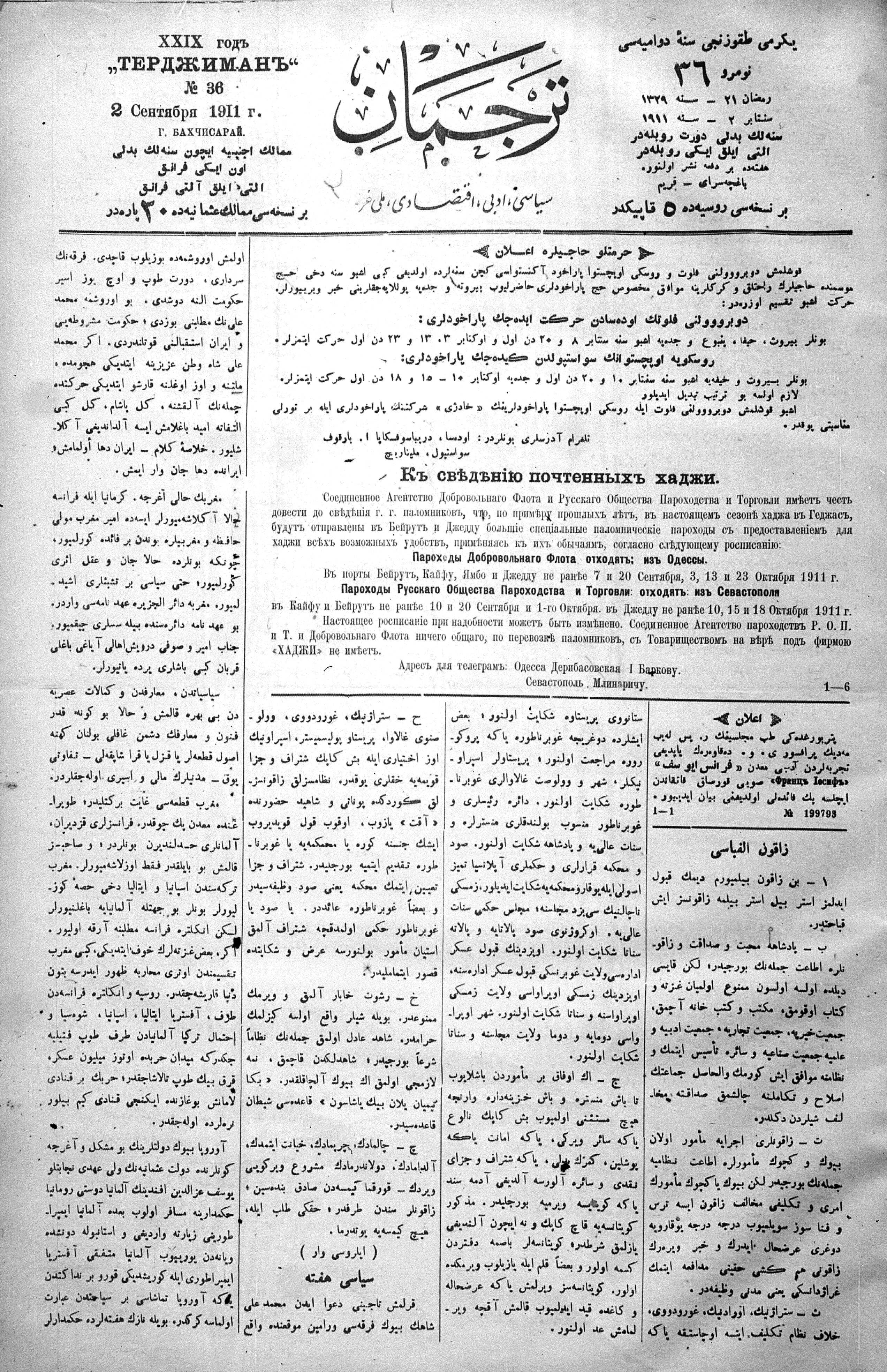 Tercüman, 02 September 1911 Year 29 No 36