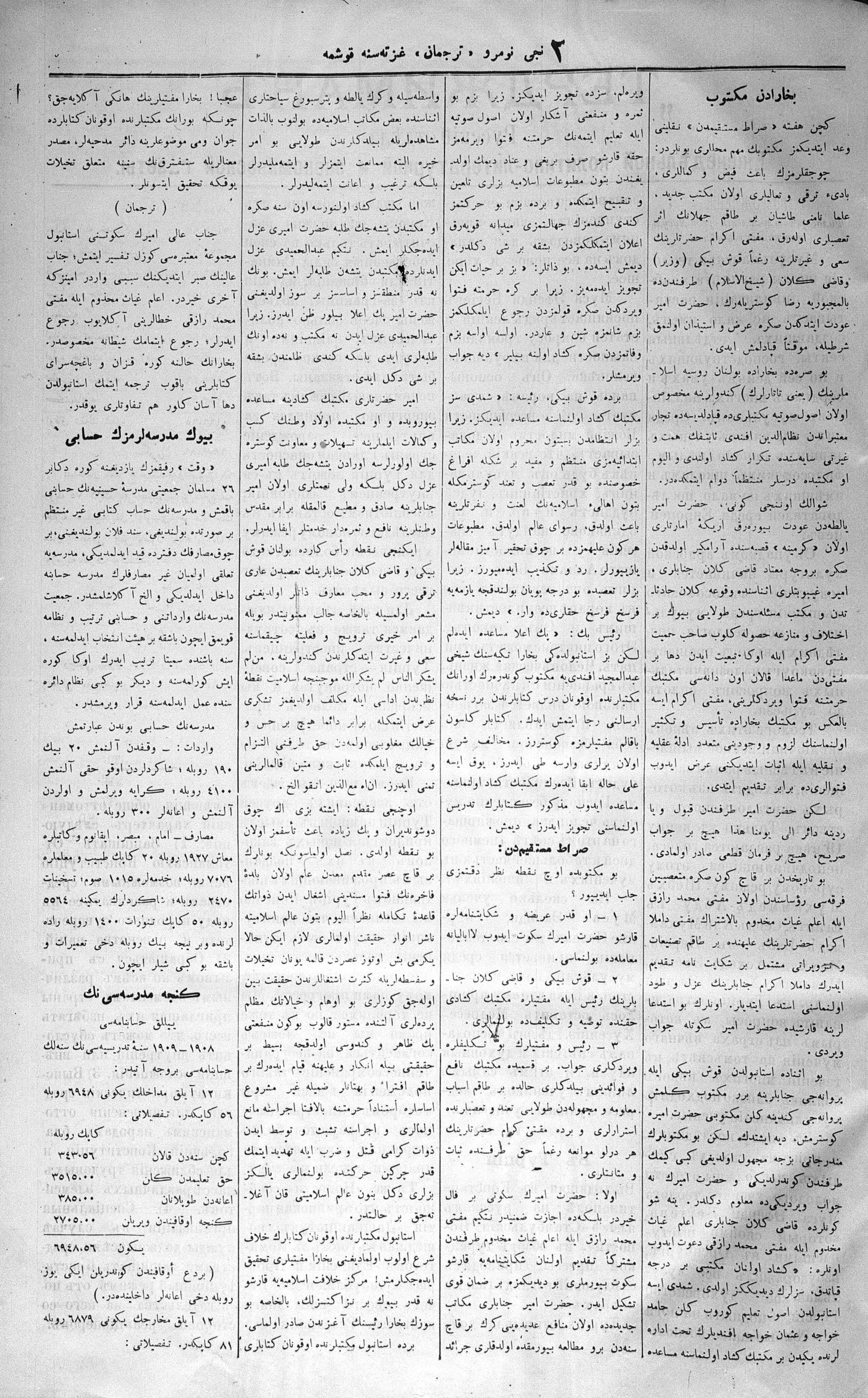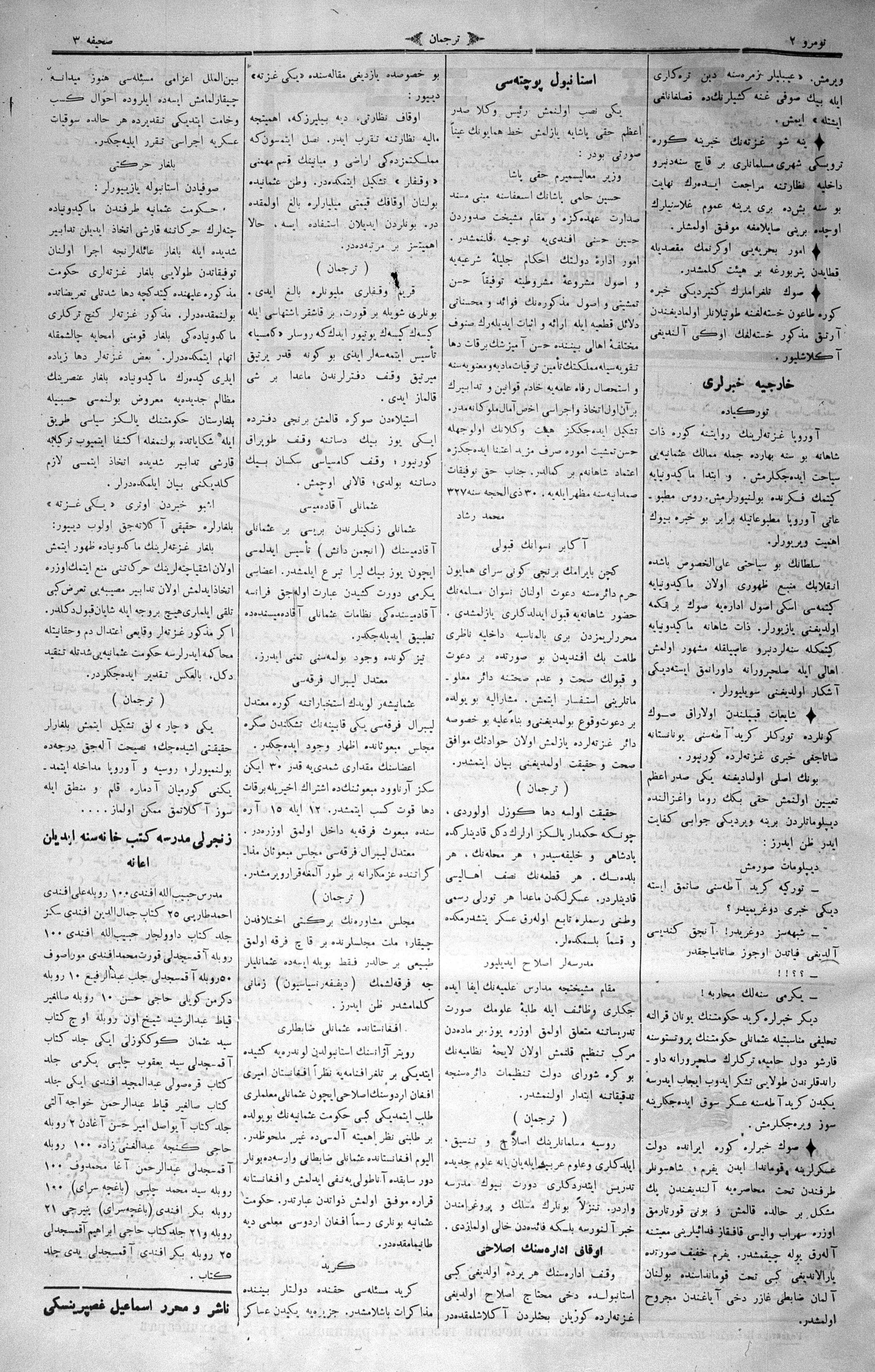 The name of the newspaper changed to Tercüman-ı Ahval-i Zaman in 1905. In 1909, it started to be published under its first name, Tercüman.