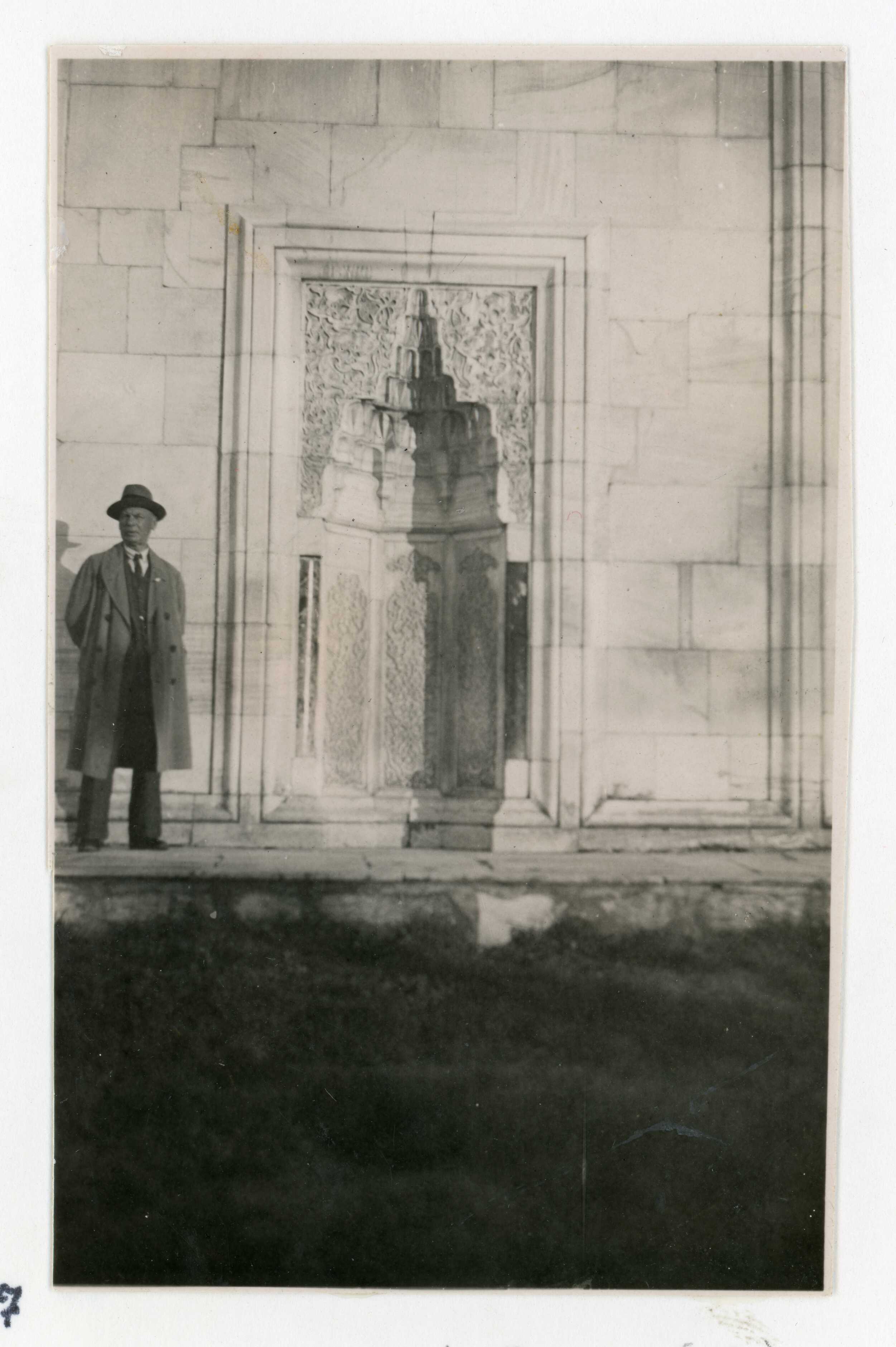 Bursa Yeşil Camii duvar detayı önünde Tevfik Bıyıklıoğlu