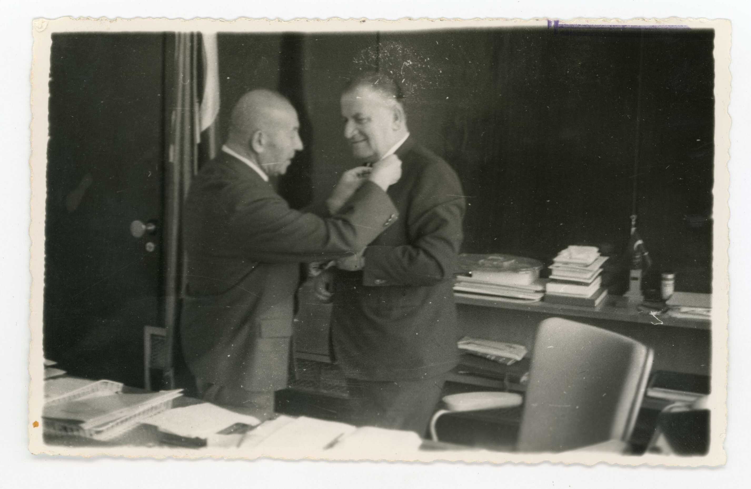 Ekrem Rüştü Akömer, İstanbul Belediye Başkanı Dr. Fahri Atabey’e Türrkiye Cankurtarma Cemiyeti rozeti takarken
