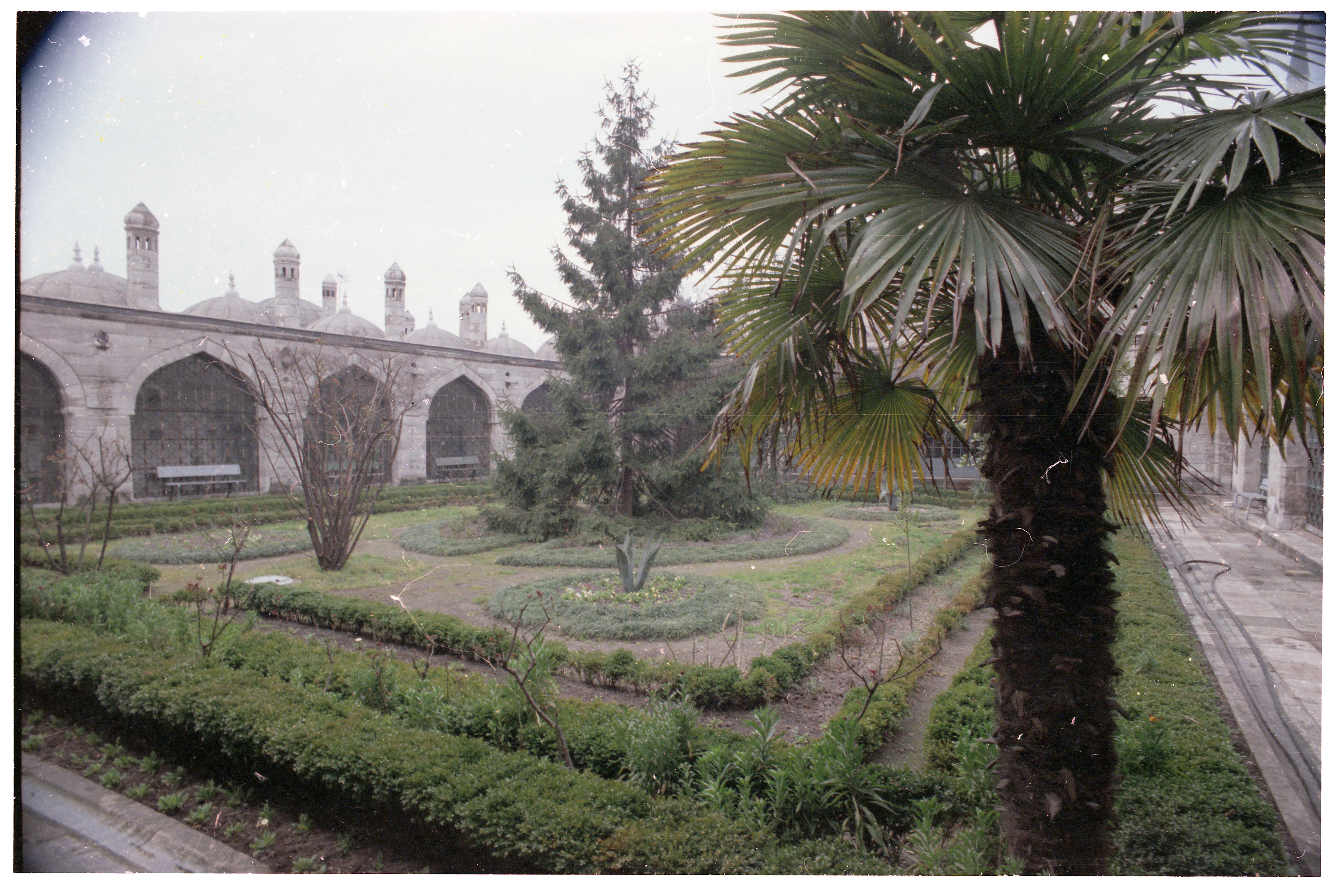 Palmiye ağacı ve çiçeklerle süslü bir avlu