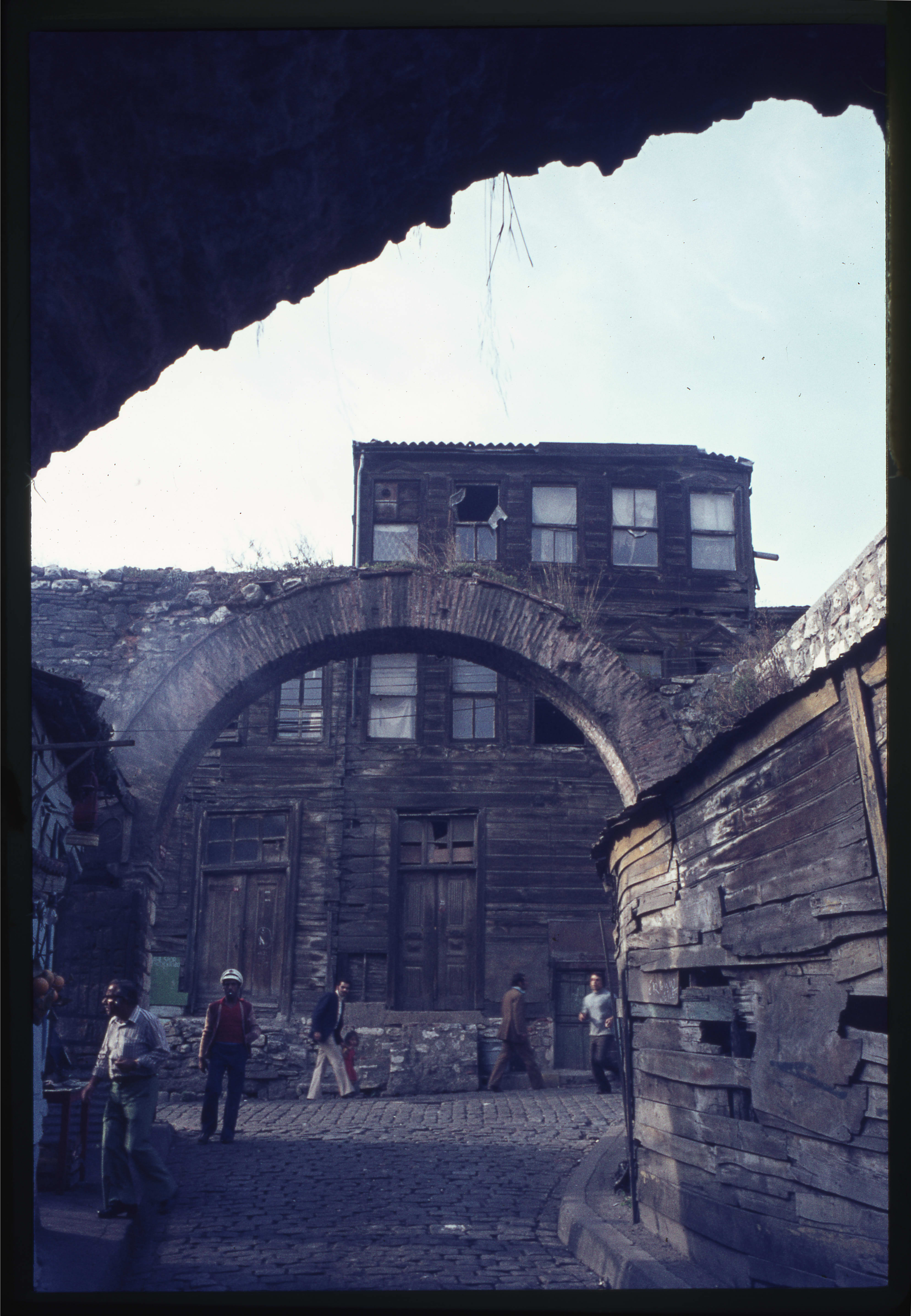 İstanbul-Ahırkapı'da bir kemer ve arkada ahşap ev