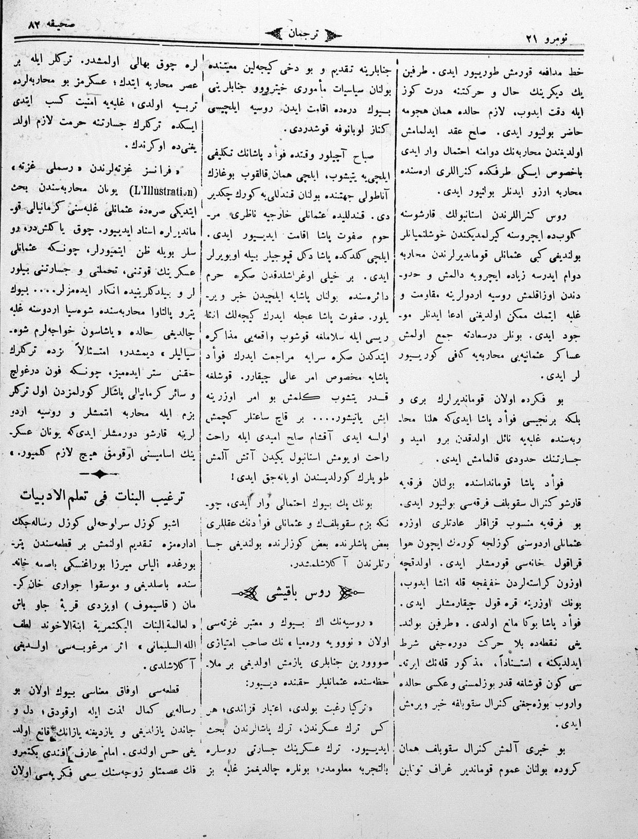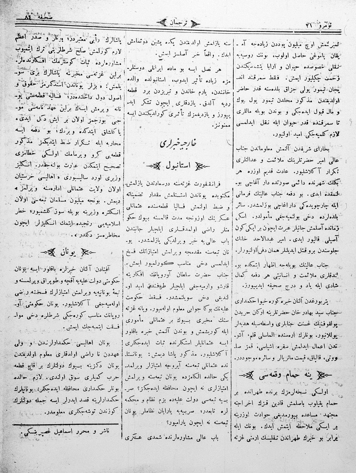 The name of the newspaper changed to Tercüman-ı Ahval-i Zaman in 1905. In 1909, it started to be published under its first name, Tercüman.