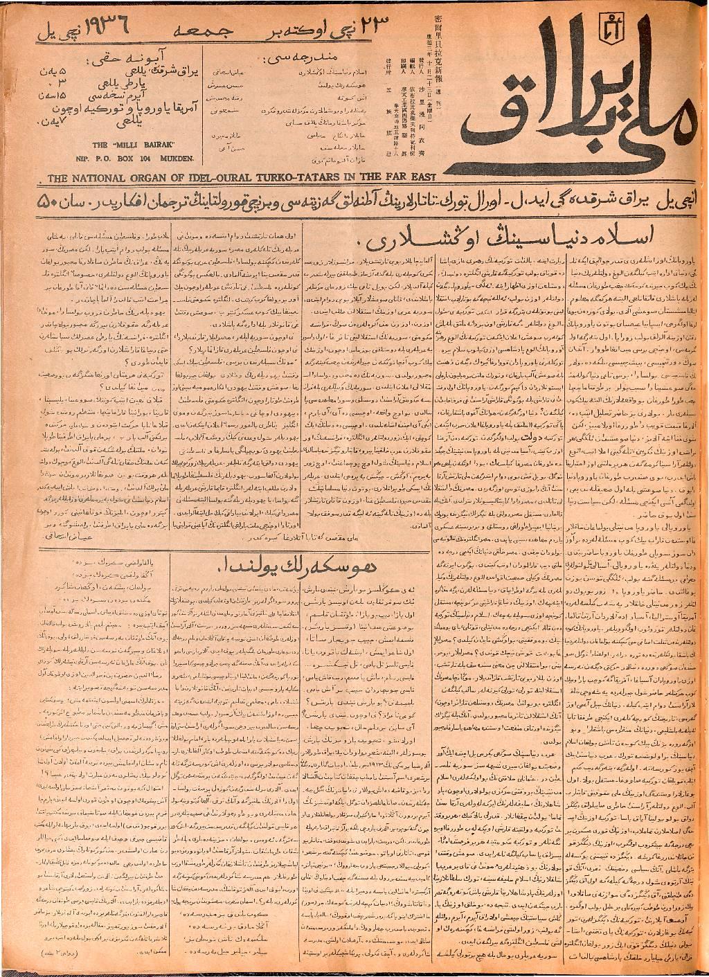 The Milli Bayrak newspaper was printed in Mukden.