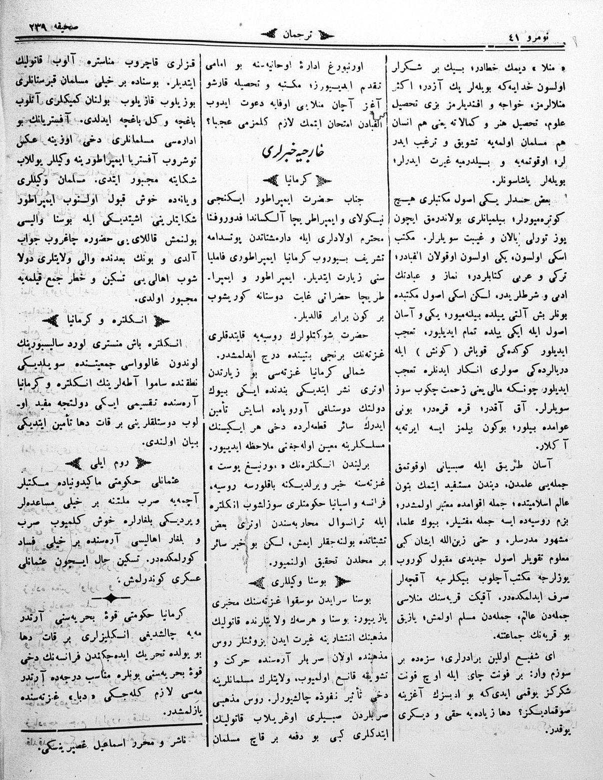 The name of the newspaper changed to Tercüman-ı Ahval-i Zaman in 1905. In 1909, it started to be published under its first name, Tercüman.