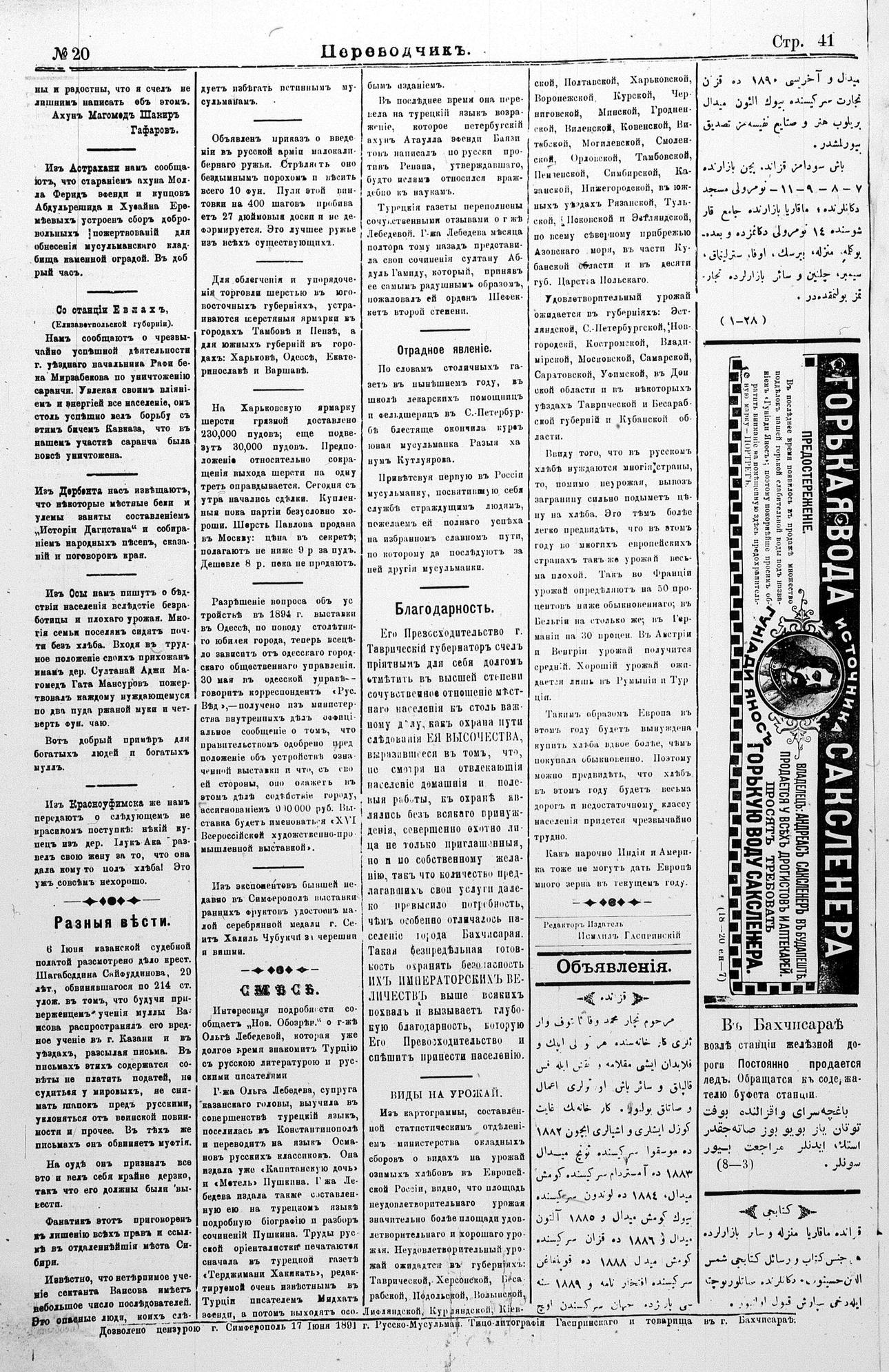 Tercüman, 18 June 1891 Year 9 No 20