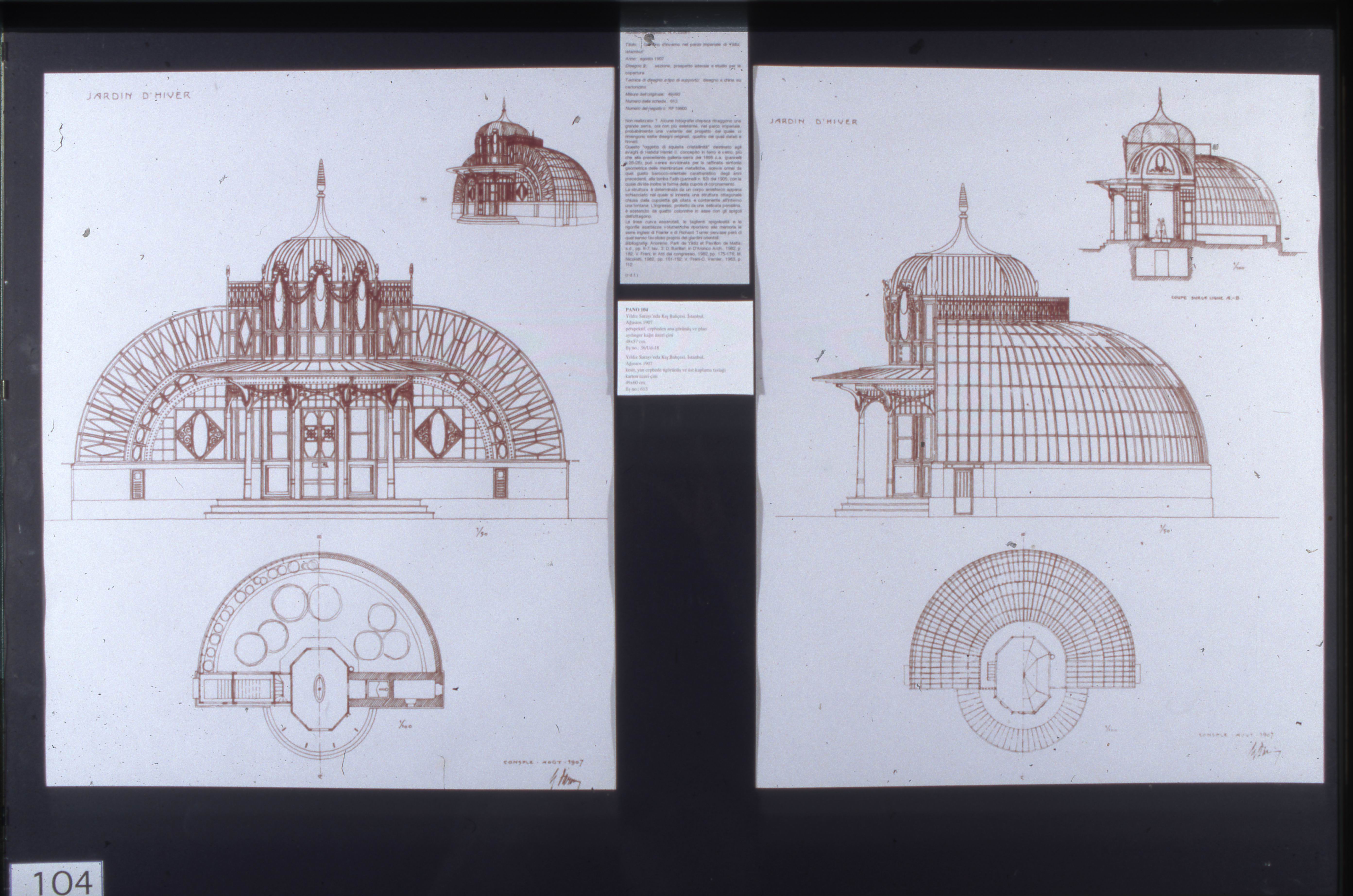 Facade views and plans of the Yıldız Palace winter garden drawn by Raimondo D'Aronco