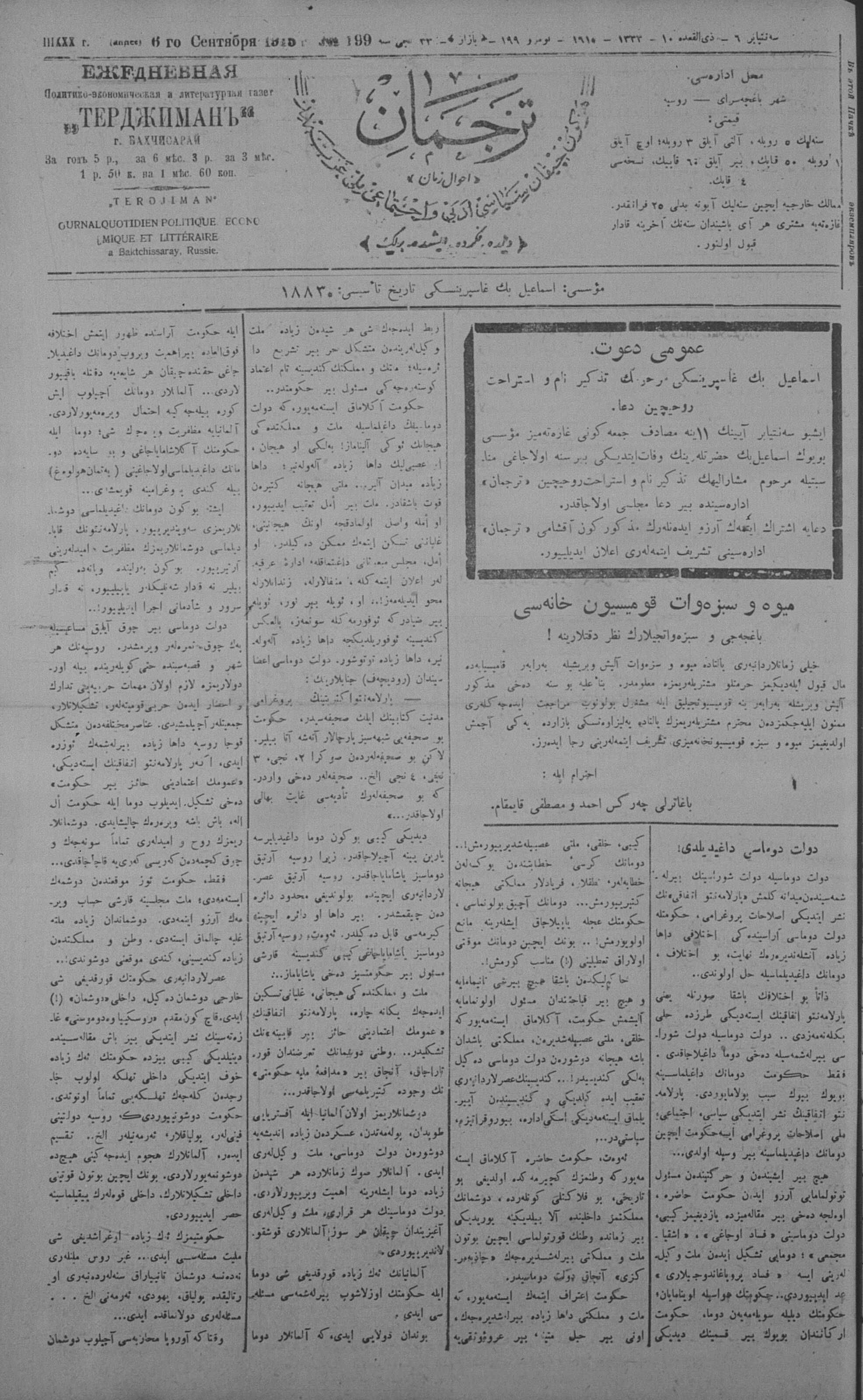 Tercüman, 06 September 1915 Year 33 No 199