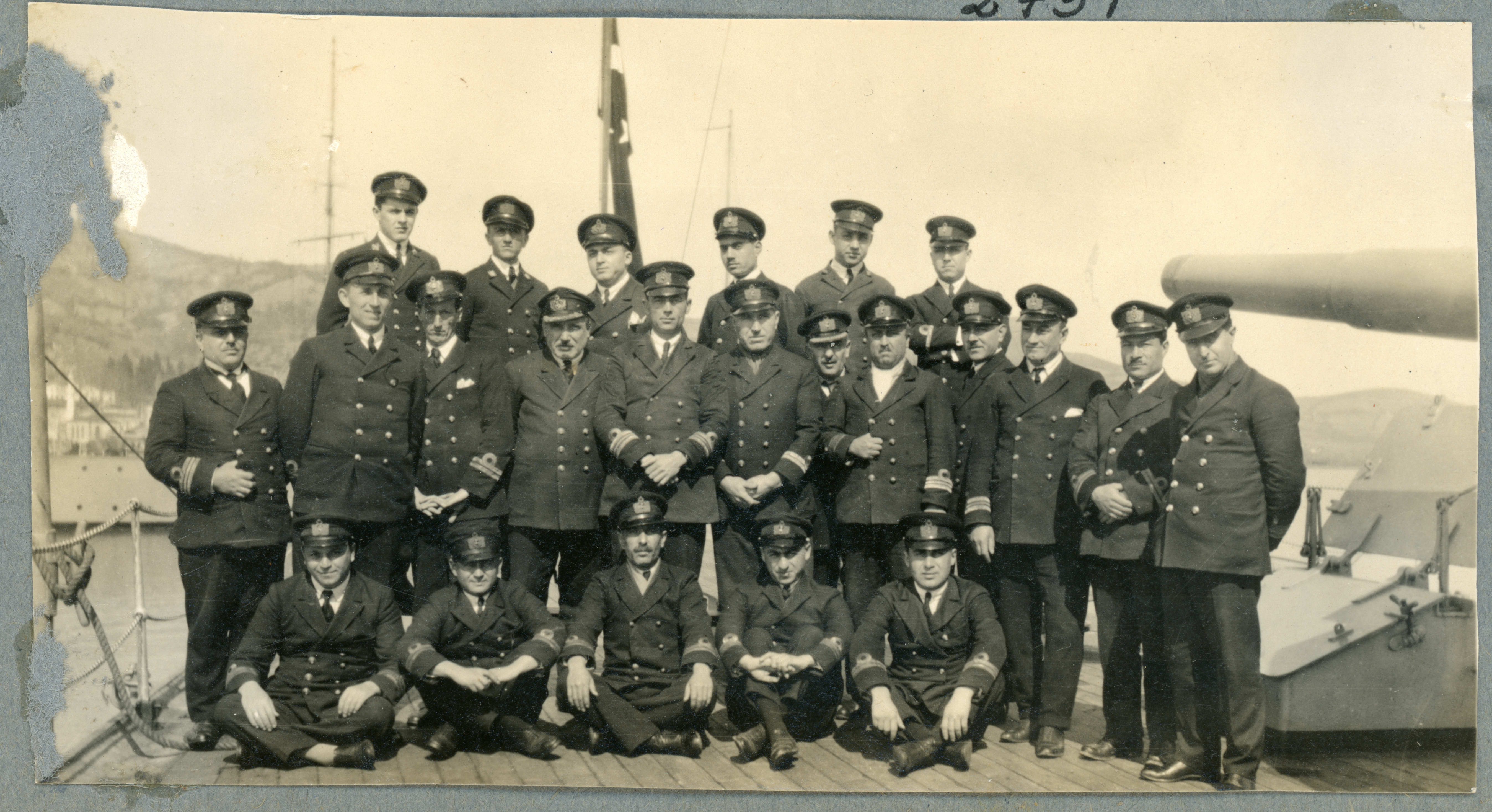 Türk donanma gemileri Boğaziçi'nden geçerken gemi güvertesinde fotoğraf çektiren bahriye subayları