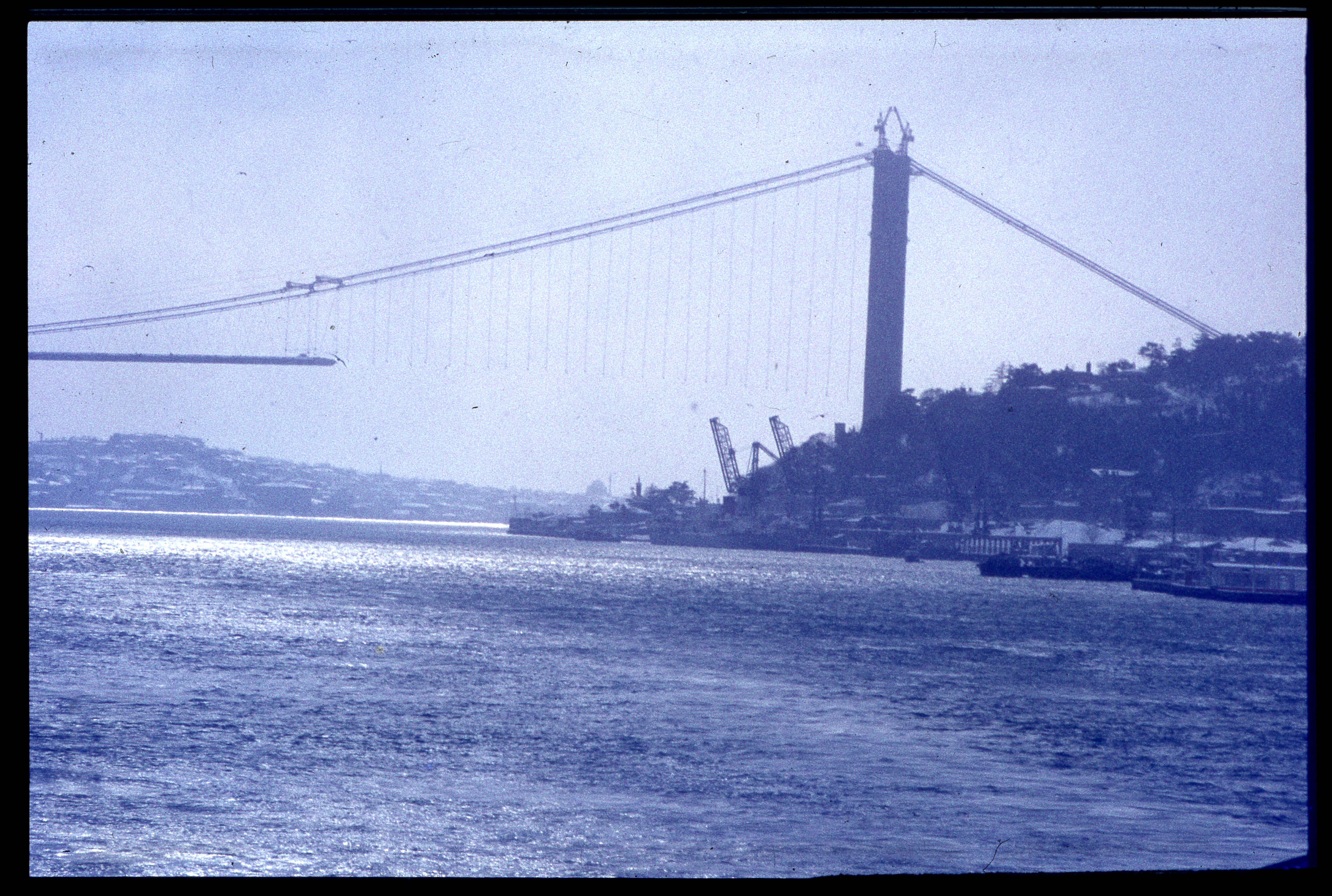 İstanbul-Karlı bir havada Boğaziçi Köprüsü yapılırken Ortaköy ayağından görünüş