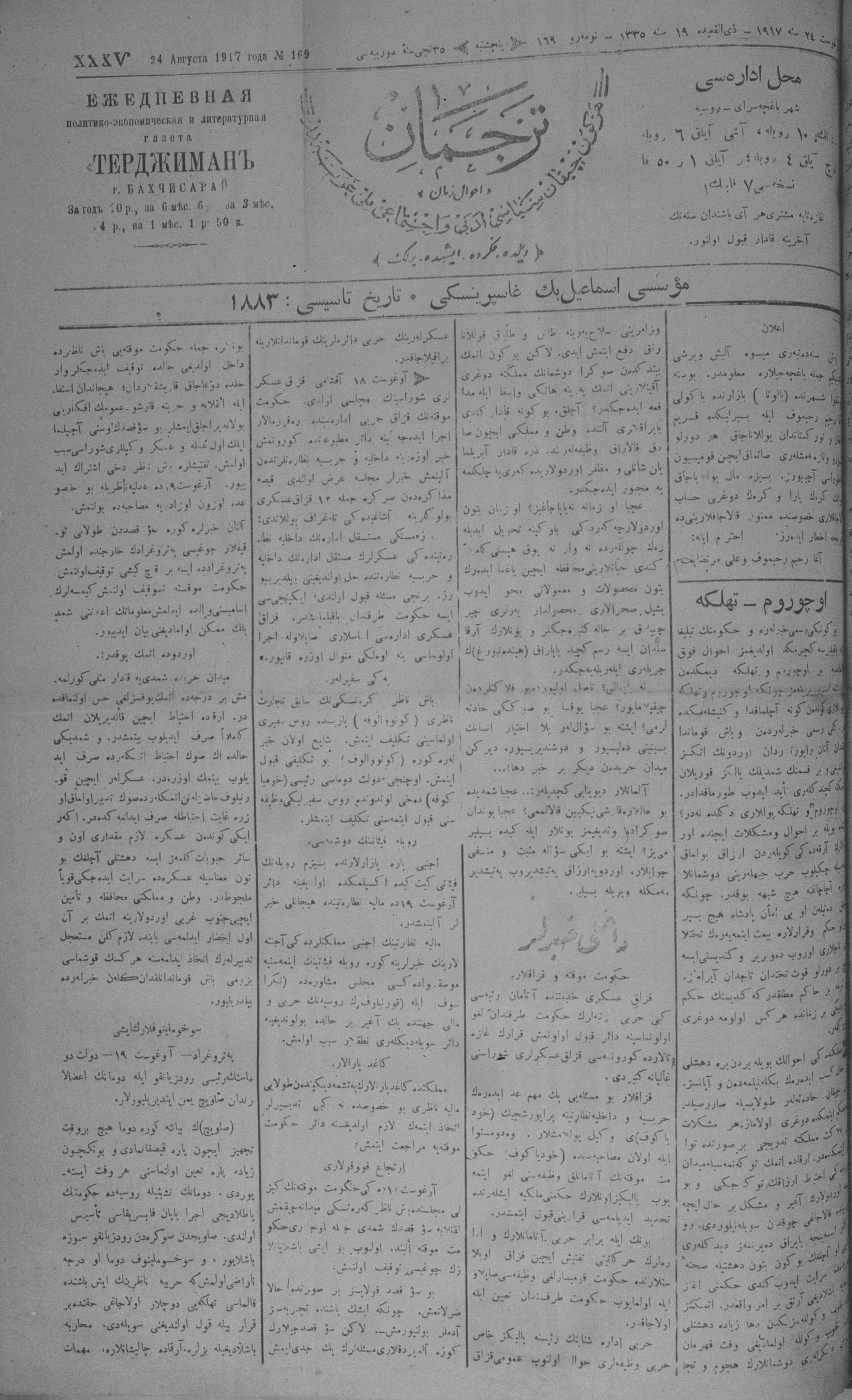 Tercüman, 24 August 1917 Year 35 No 169