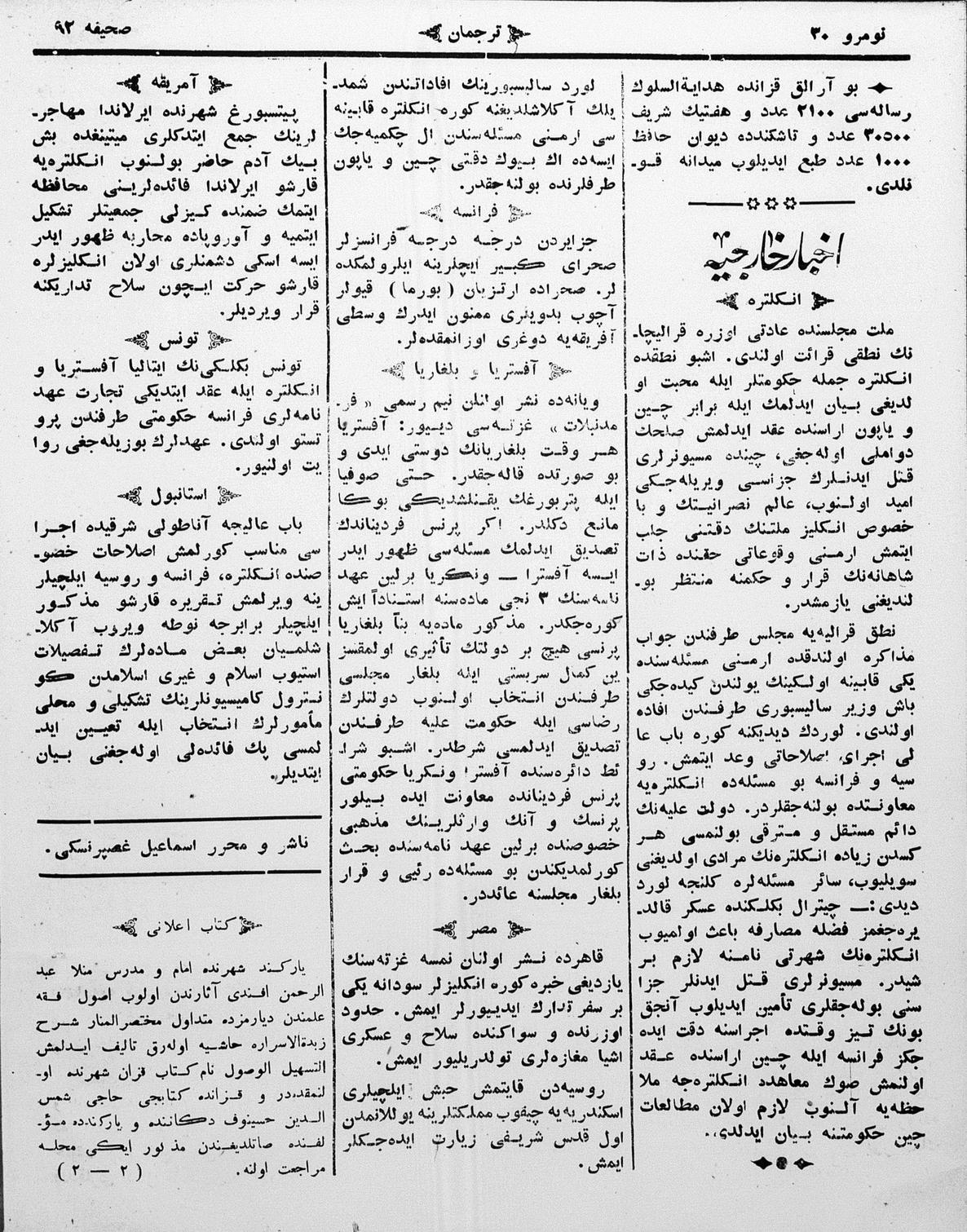 The name of the newspaper changed to Tercüman-ı Ahval-i Zaman in 1905. In 1909, it started to be published under its first name, Tercüman.