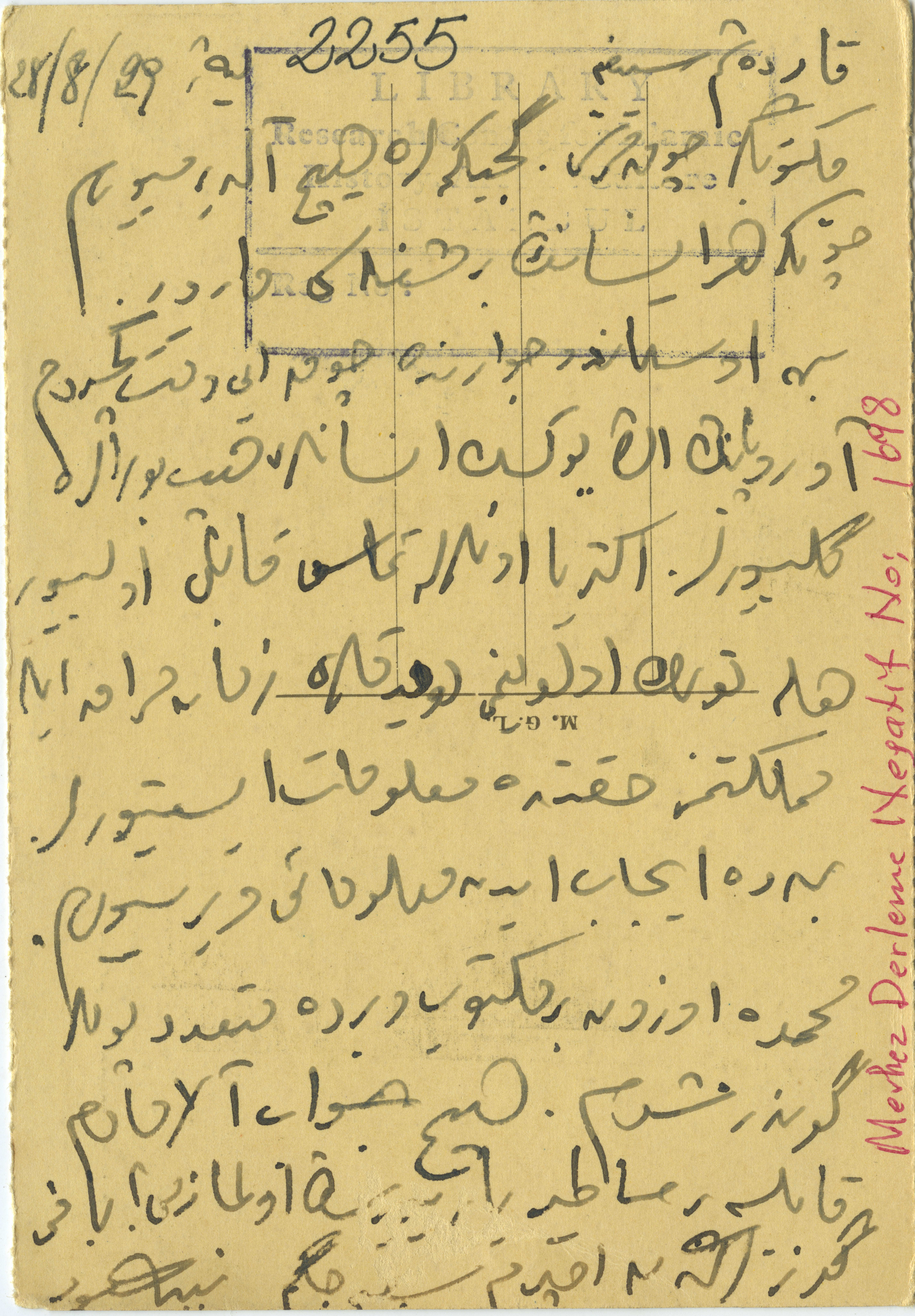 A postcard sent to Seyfiye in 28.08.1929 mentions that your letters are very short, that the most prominent people in Europe come here, that contact with them is possible, and that when they learn we are Turkish, they ask us about our country.