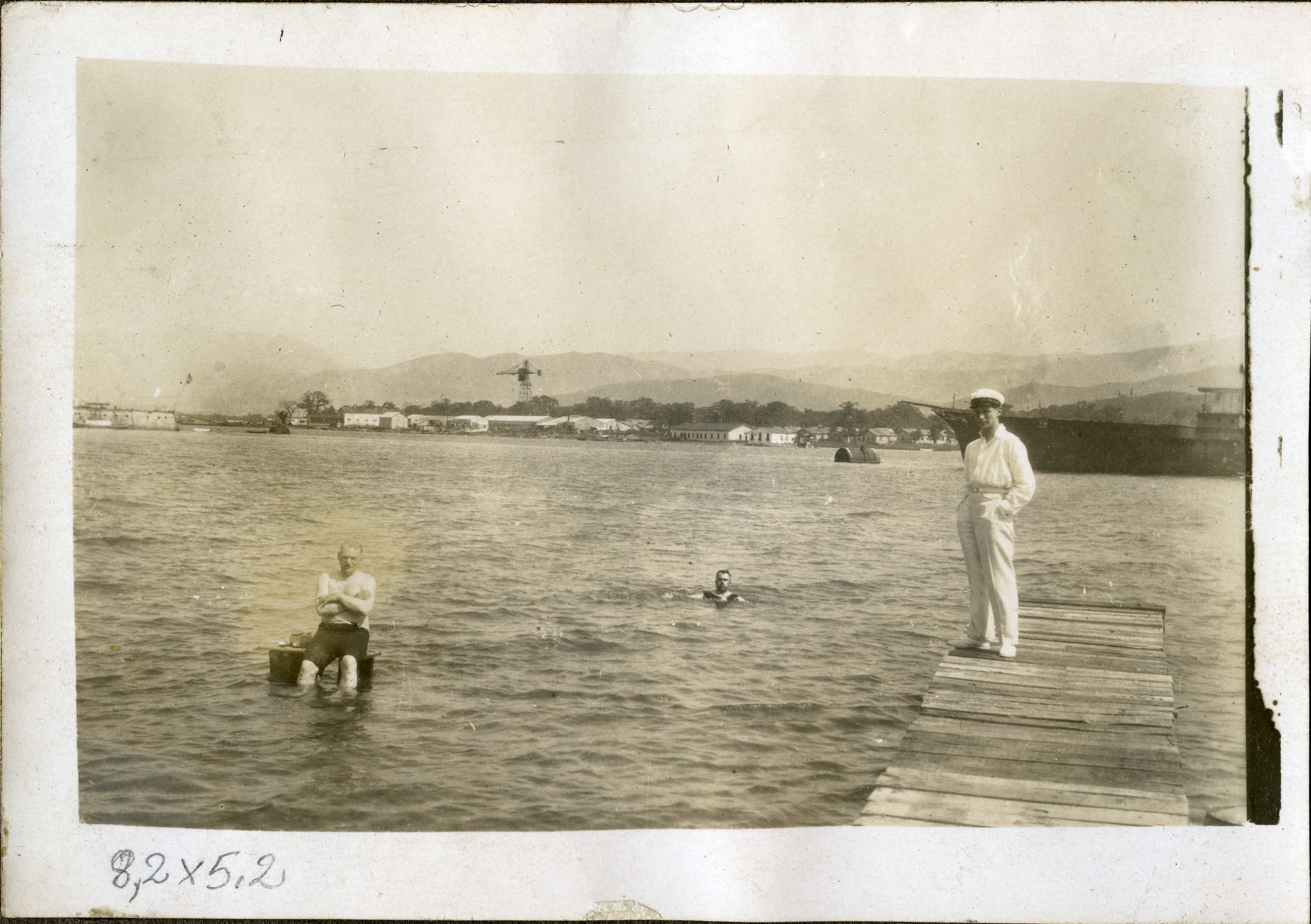 Bir iskelede hatıra fotoğrafı çektiren bir denizci, donanma gemisi ve yüzenler