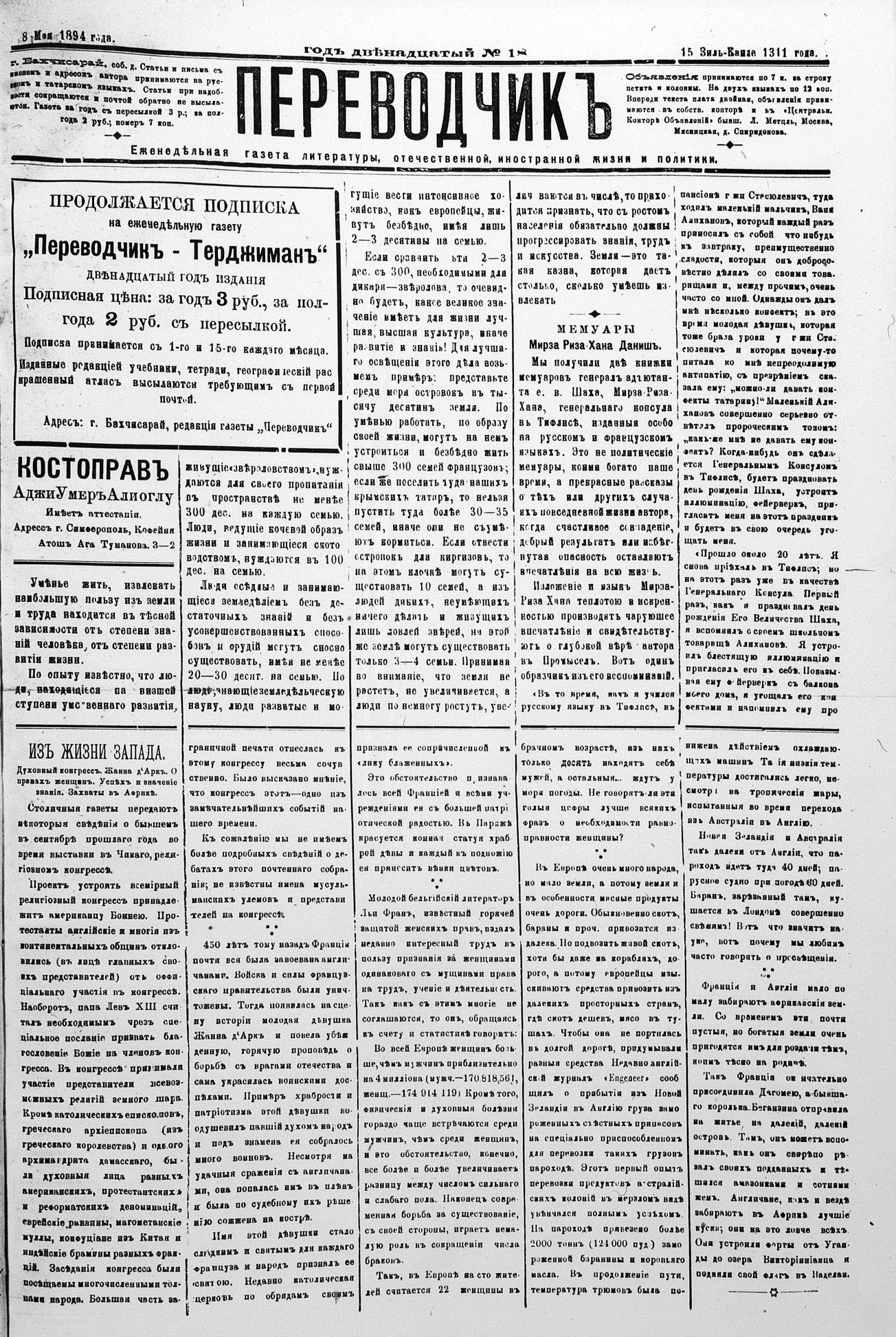 Turkish-Russian newspaper published in Crimea by İsmail Gaspıralı.