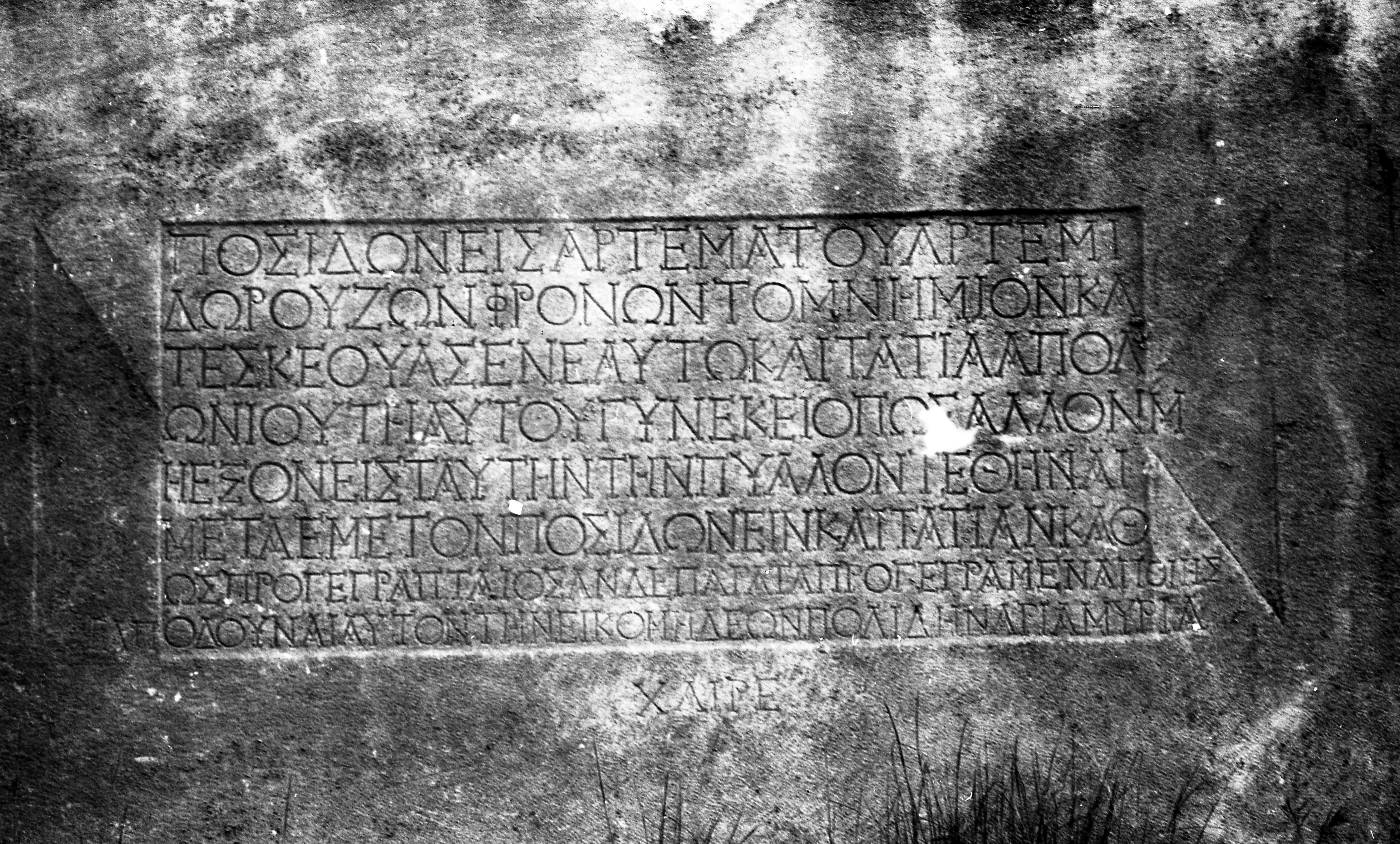 “Artemata ve Artemidoros’un oğulları Poidonei ve Apollonios kızı Tatia yaşarken bu lahdi kendilerine hazırlattılar. Yoldan geçenlere ve denizden geçenlere selam olsun”