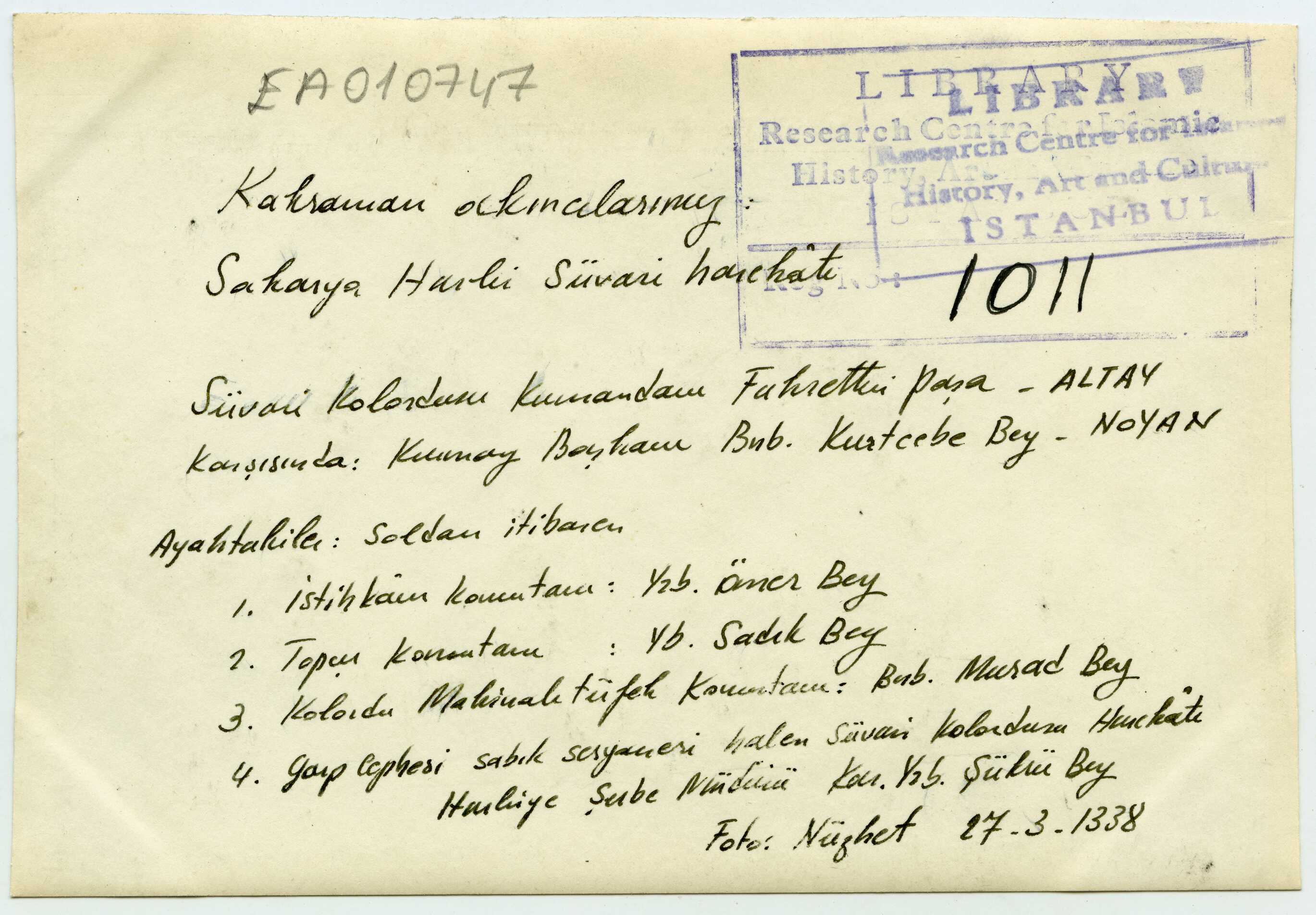 Fahrettin Pasha (Fahrettin Altay), Commander of the 5th Cavalry Corps; Major Noyan Kurtcebe, Commander-in-Chief of the 5th Cavalry Corps; Captain Ömer, Commander of Engineering; Lieutenant Colonel Sadık, Commander of Artillery; Major Murat, Commander of Machine Guns; and Staff Lieutenant Colonel Şükrü, former aide-de-camp of the Western Front and Head of Operations Branch of the Cavalry Corps.