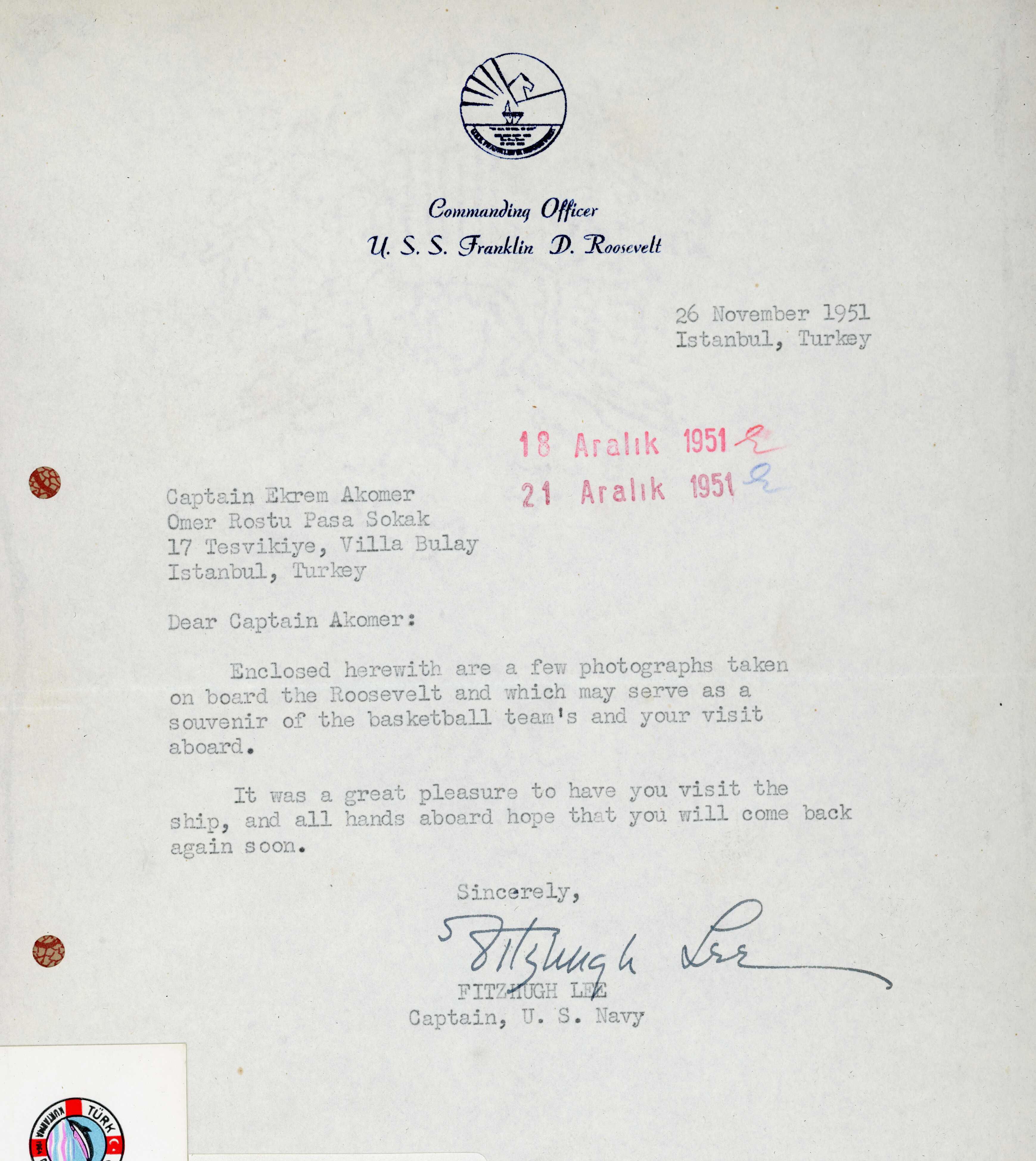 Ekrem Rüştü Akömer ve basketbol takımının U.S.S. Franklin D. Roosevelt Gemisi'ni ziyaretleri hatırası olmak üzere bazı fotoğraflar gönderdiğine dair Gemi Kaptanı Fitzhugh Lee’nin Ekrem Akömer’e gönderdiği 26.11.1951 tarihli İngilizce mektup
