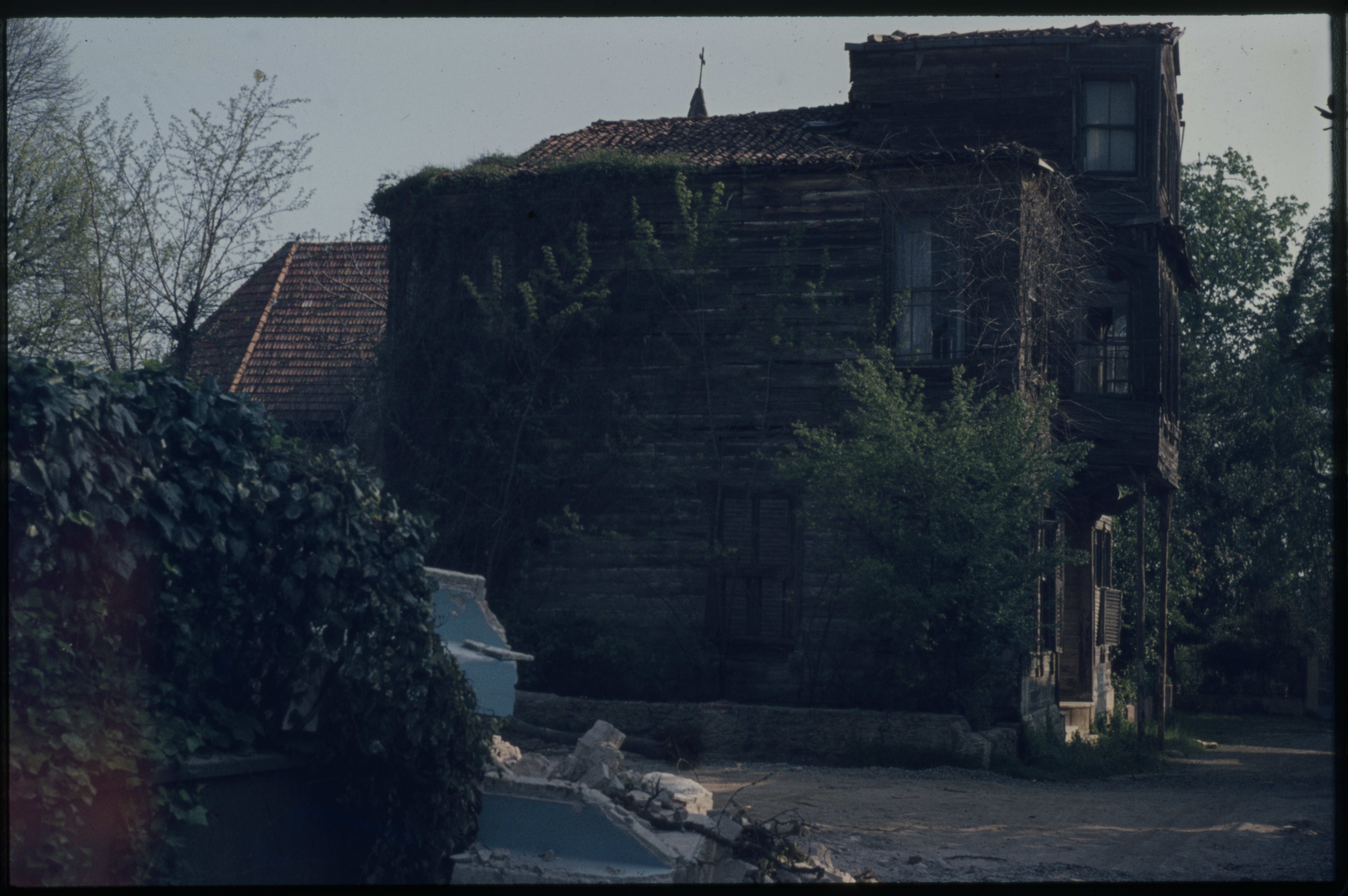 Arkasında kilise bulunan ahşap bir ev