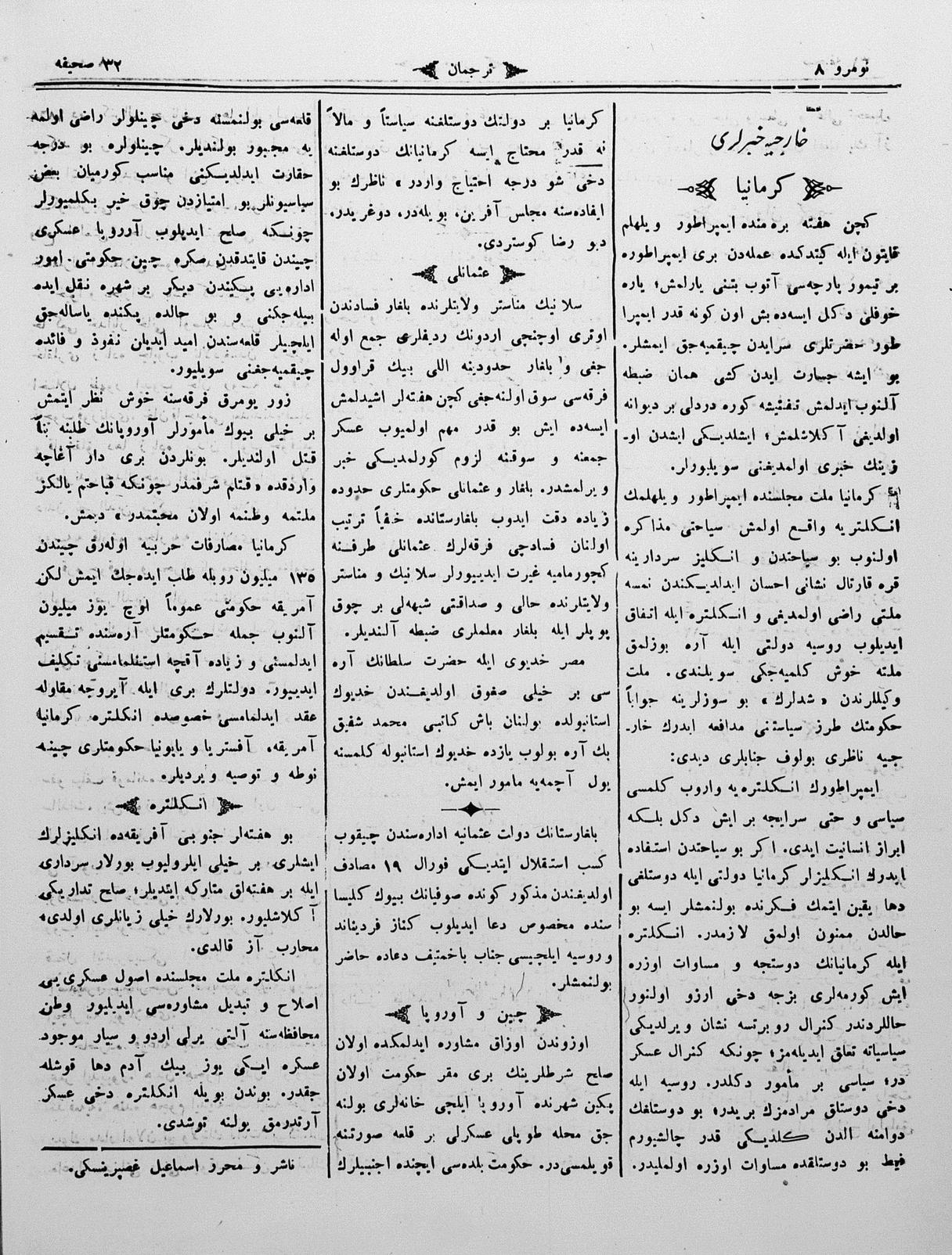 The name of the newspaper changed to Tercüman-ı Ahval-i Zaman in 1905. In 1909, it started to be published under its first name, Tercüman.