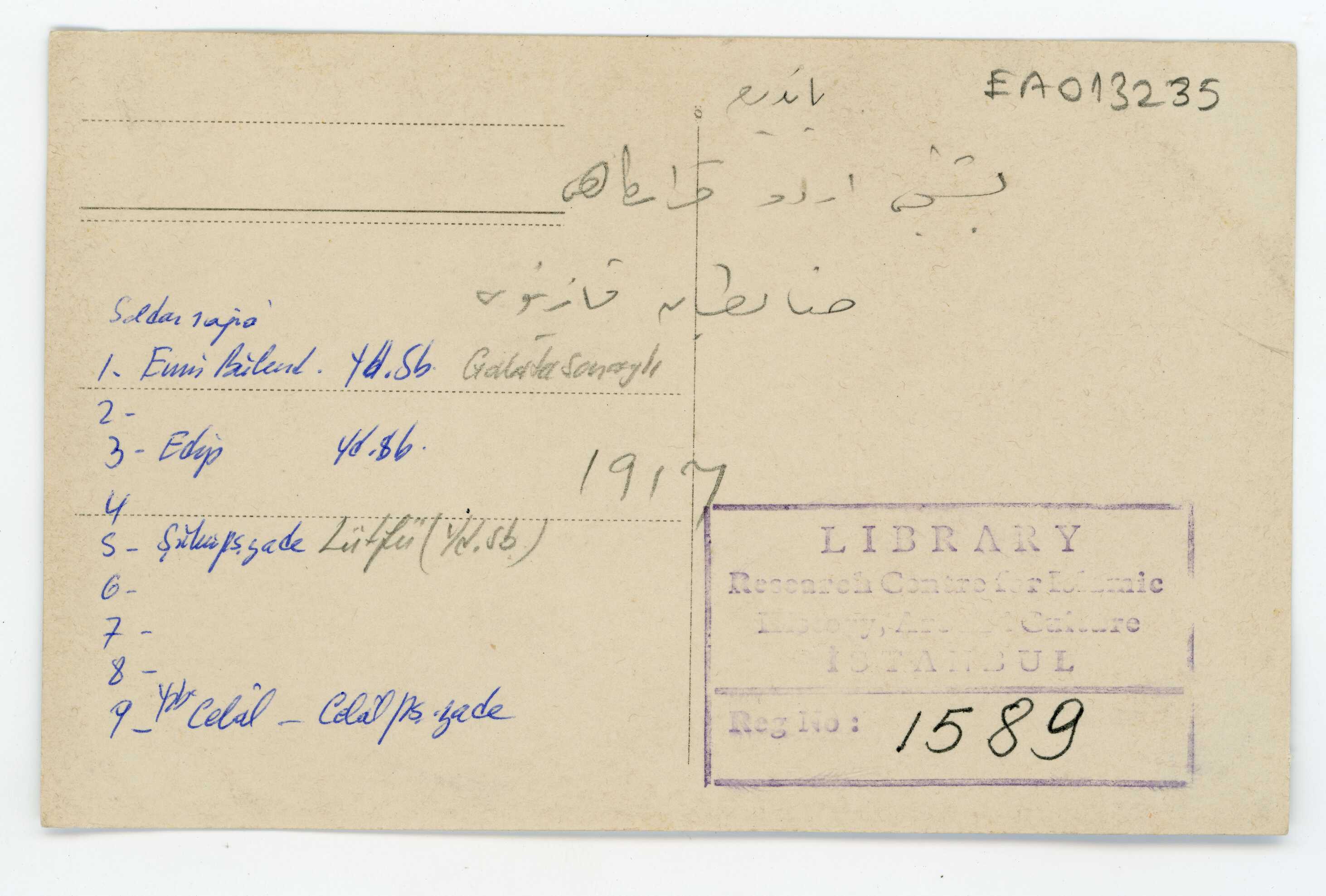 From left to right: 1- Emin Bülend, reserve officer, 2-?, 3- Edip, reserve officer, 4-?, 5-Lütfi (Şükrü Pasha's son), reserve officer, 6-?, 7-?, 8-?, 9- Captain Celal (Celal Pasha's son).