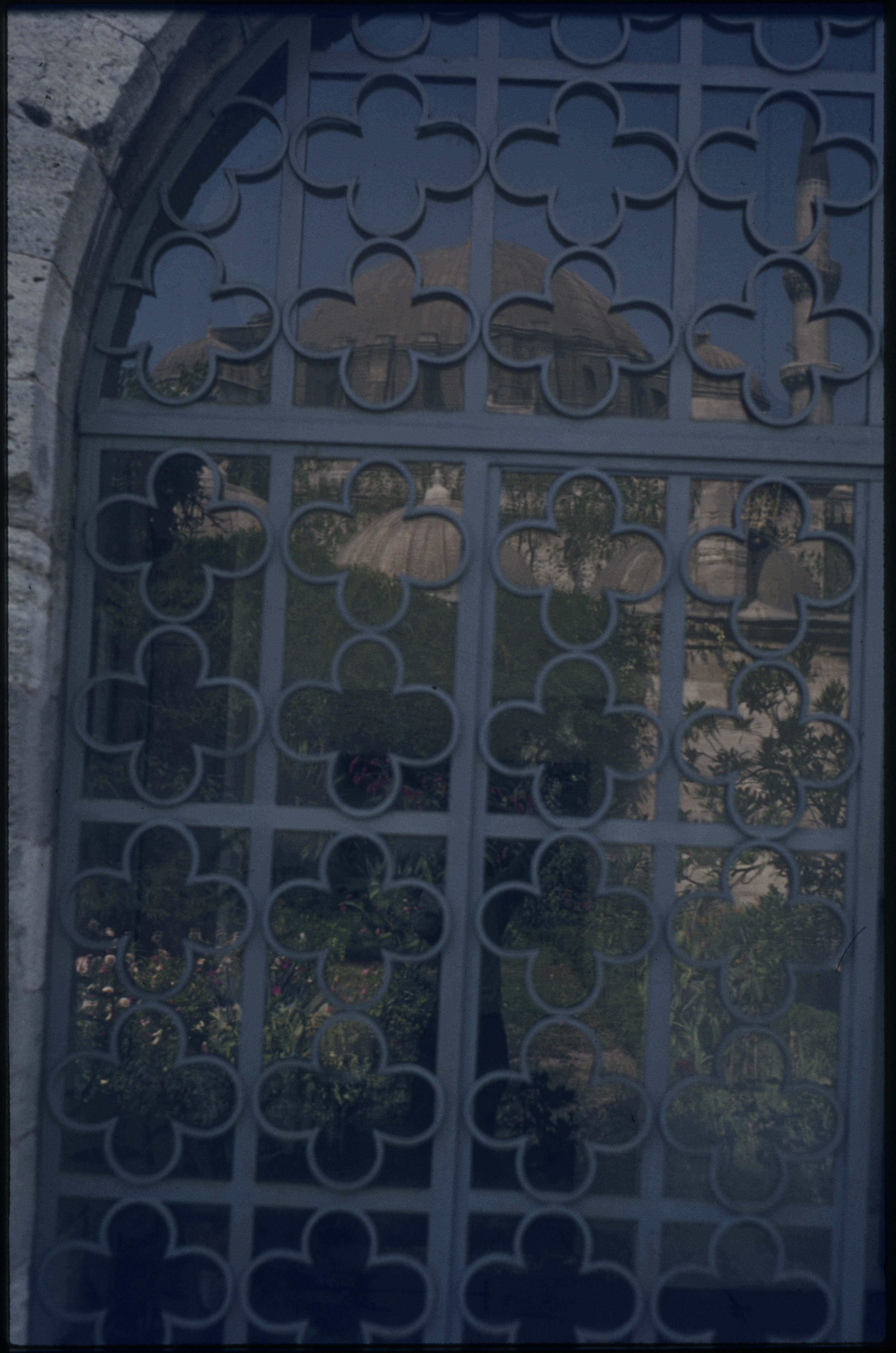 Kafesli bir pencerenin yansımasında Süleymaniye Camii'nin görünüşü