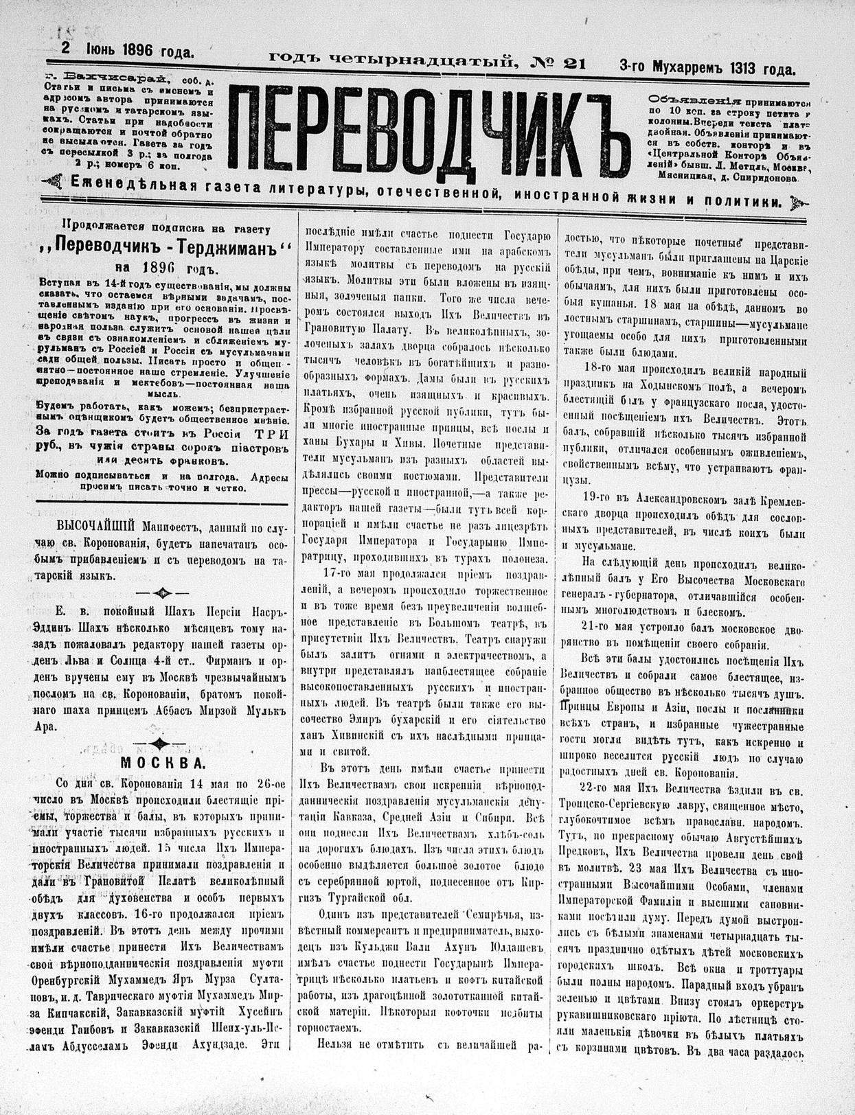 Tercüman, 02 June 1896 Year 14 No 21