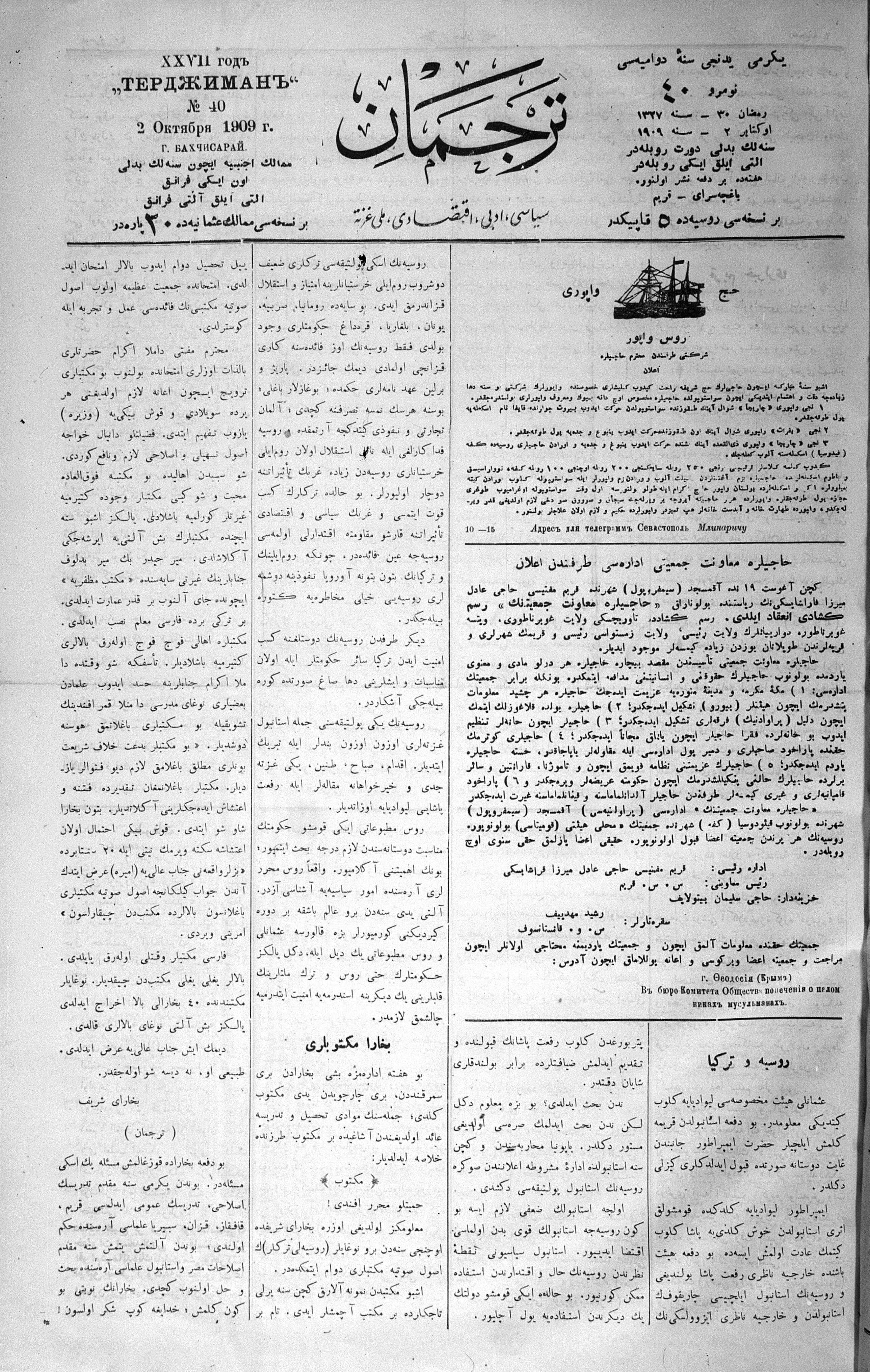 Tercüman, 02 October 1909 Year 27 No 40