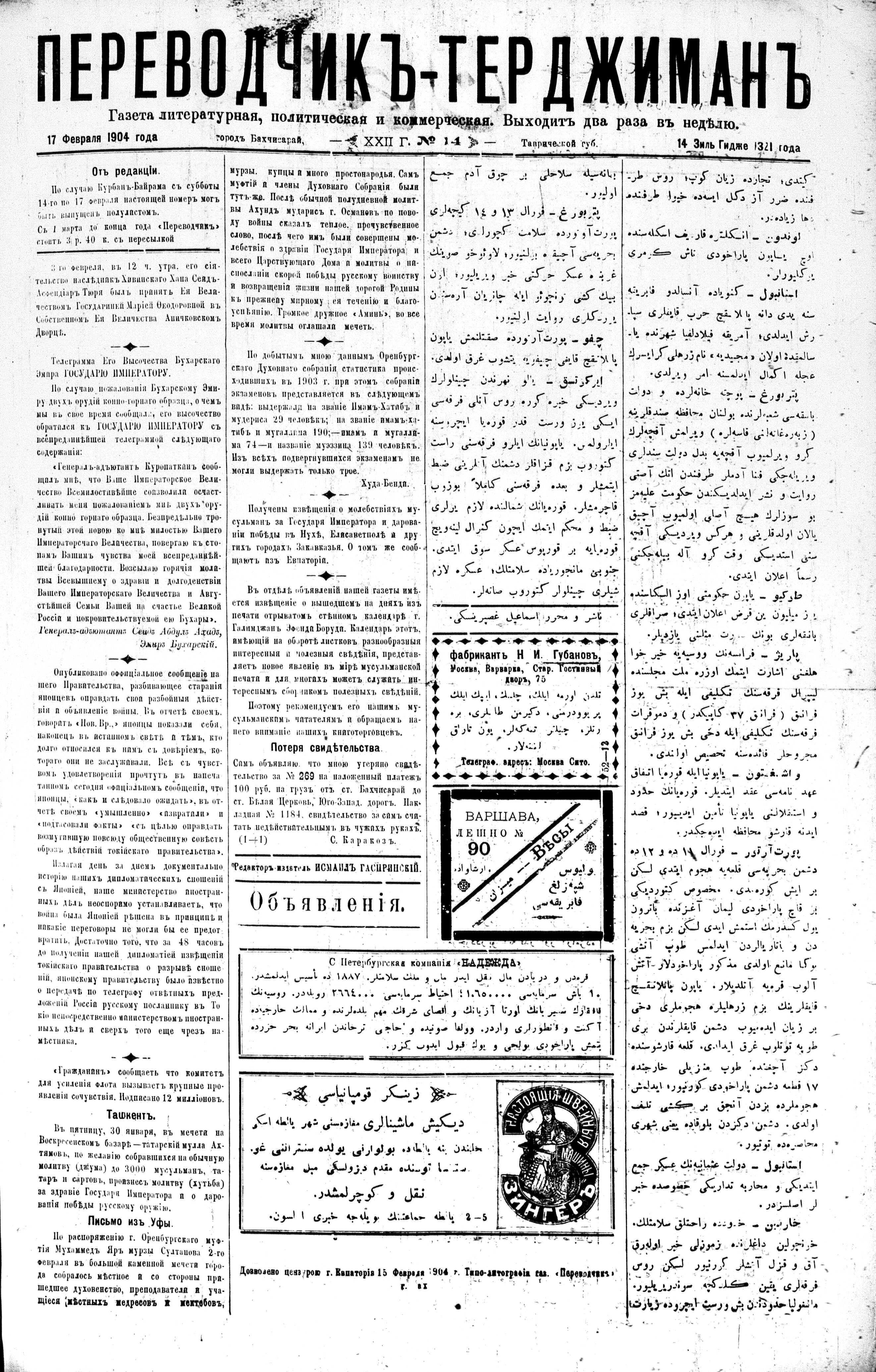 Tercüman, 17 February 1904 Year 22 No 14