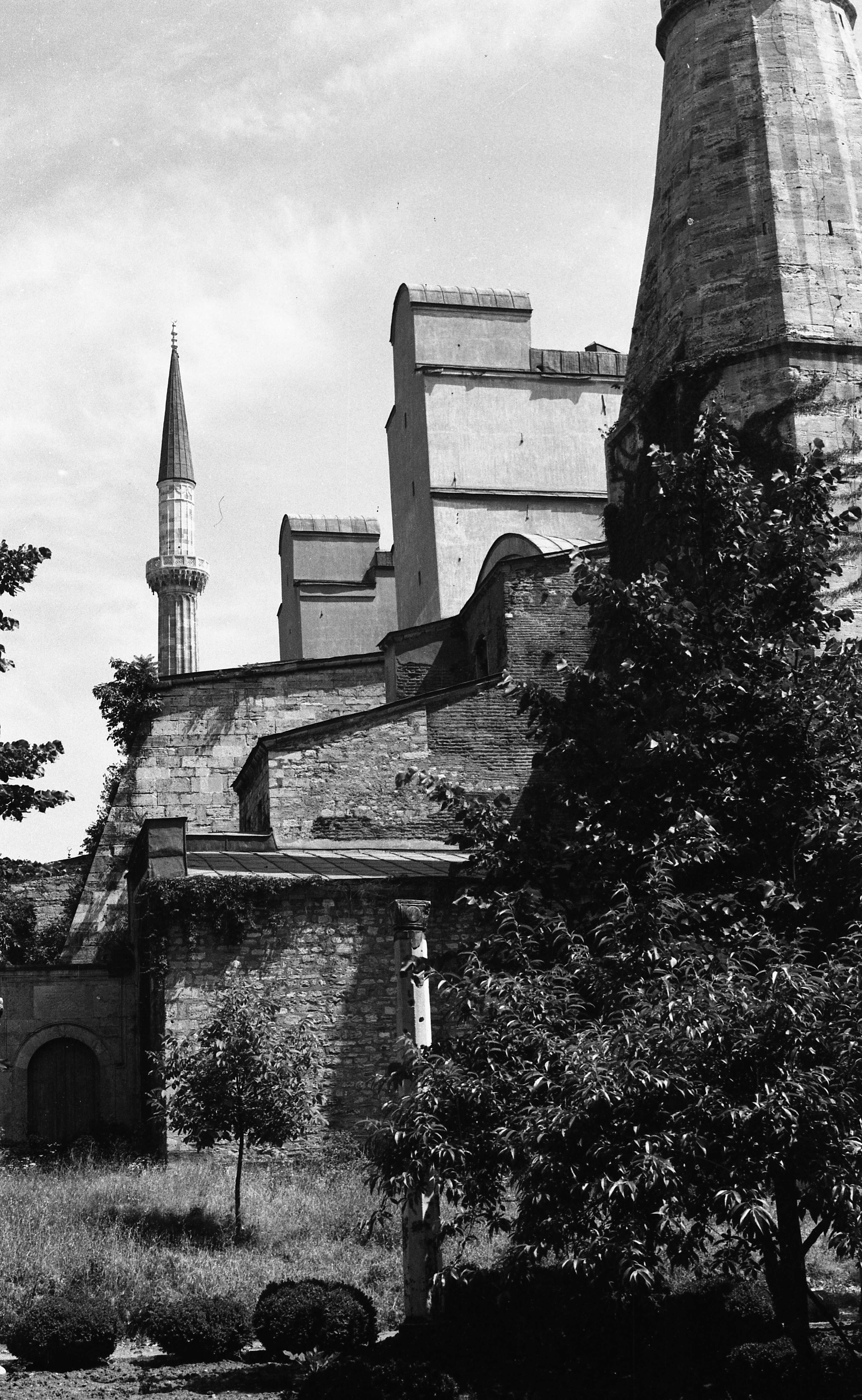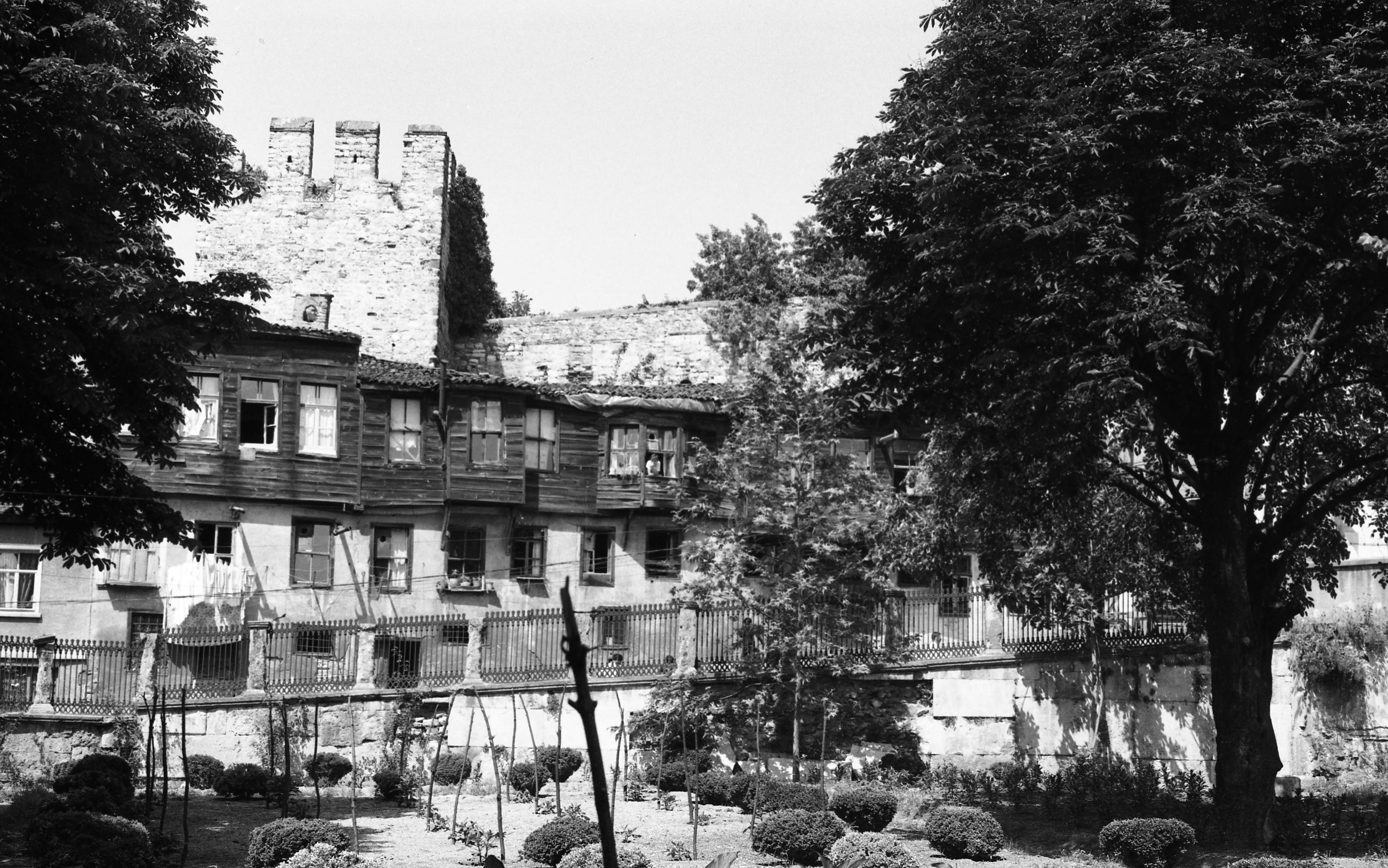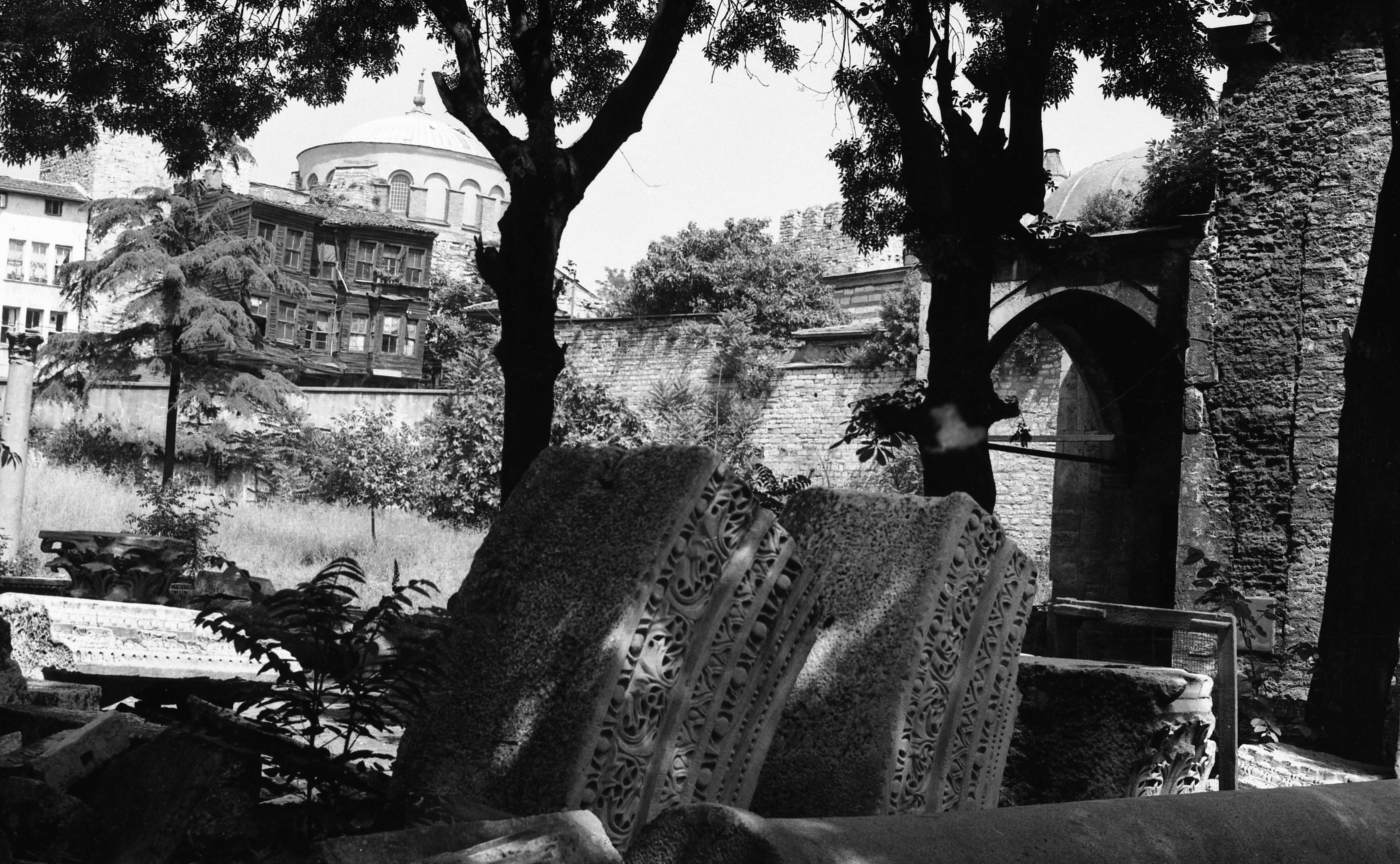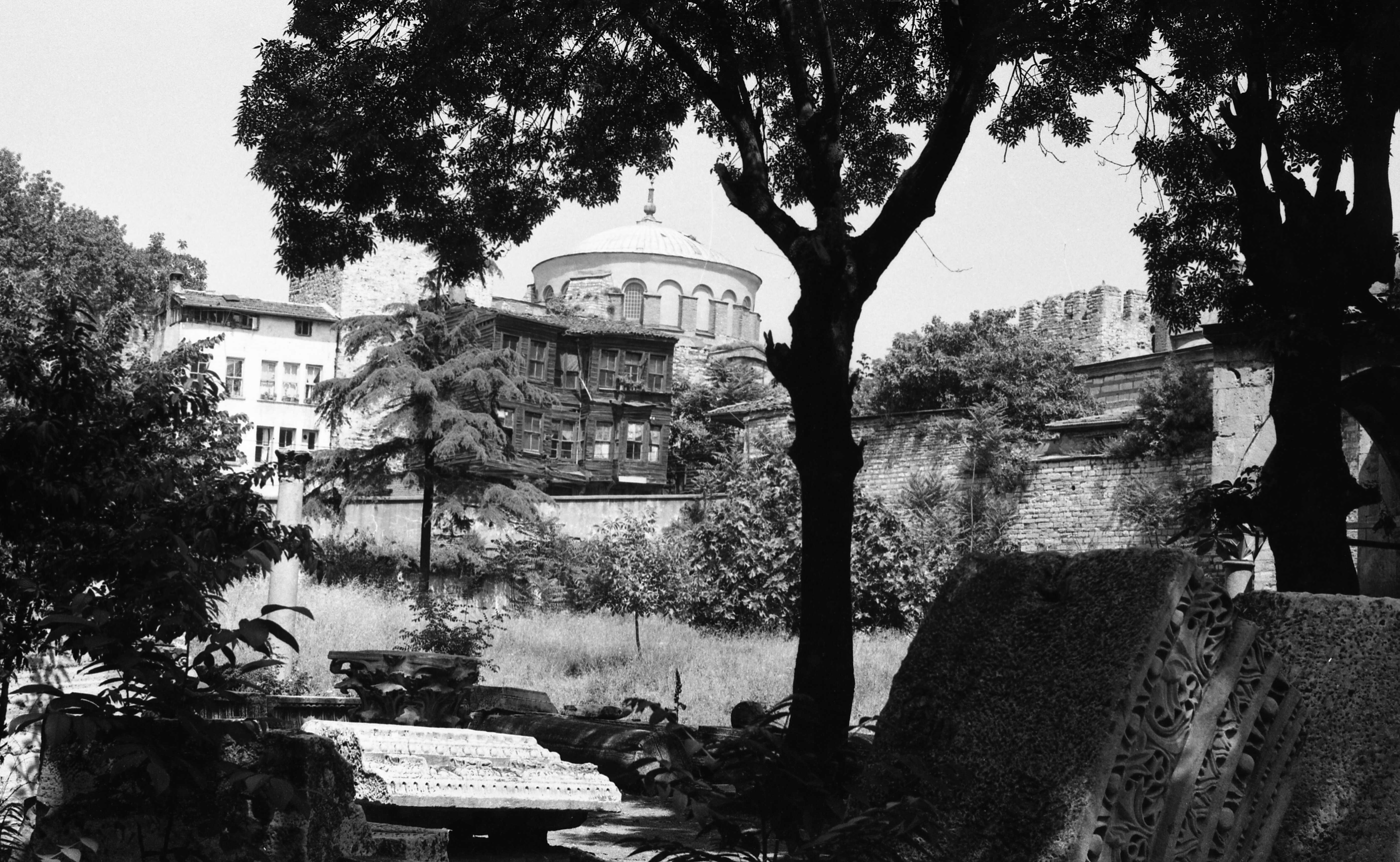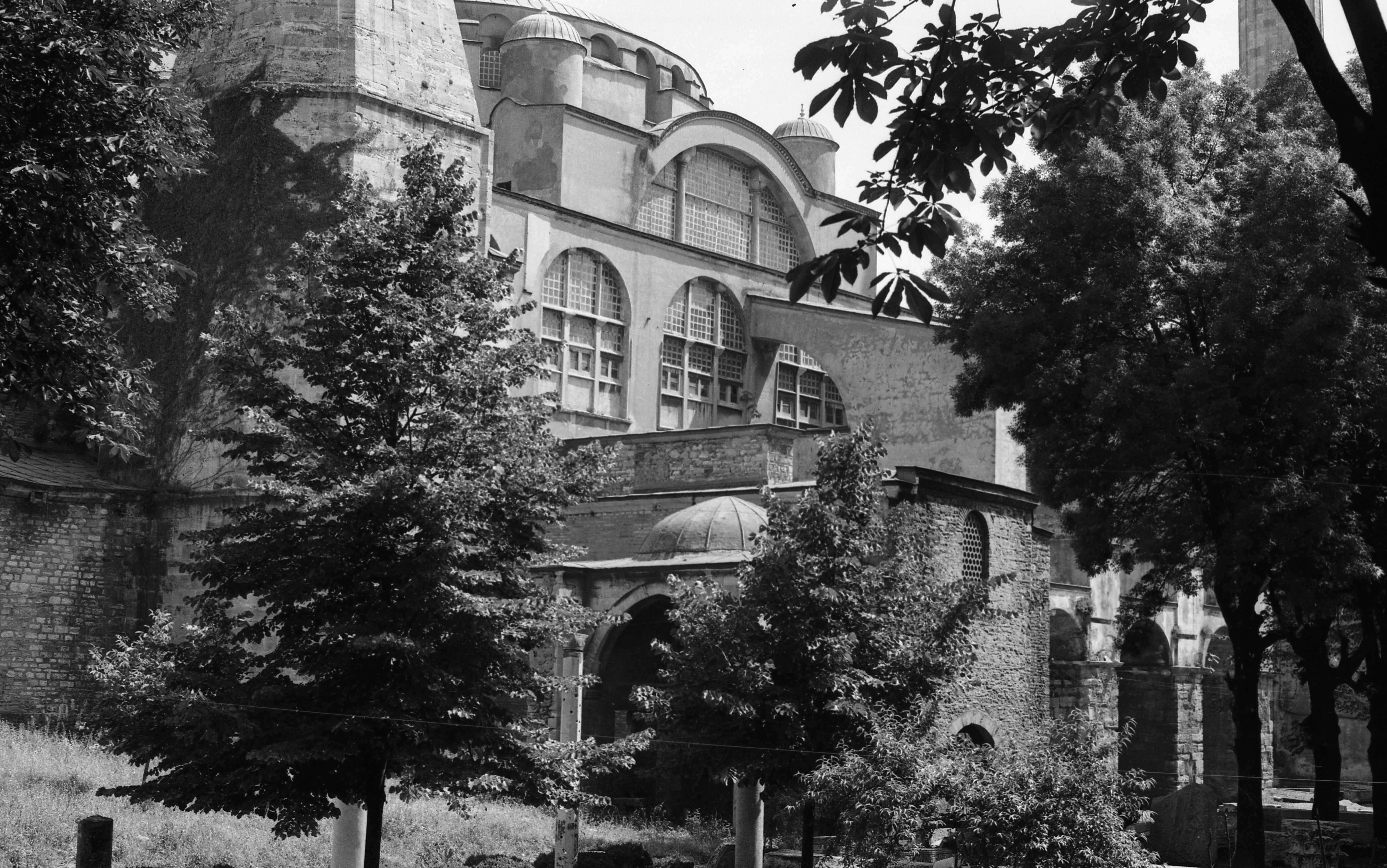 Ayasofya Camii'nin bahçesi ve bahçesinden Soğukçeşme Sokağı'ndaki evler ile St Irene Kilisesi'nin görünüşü