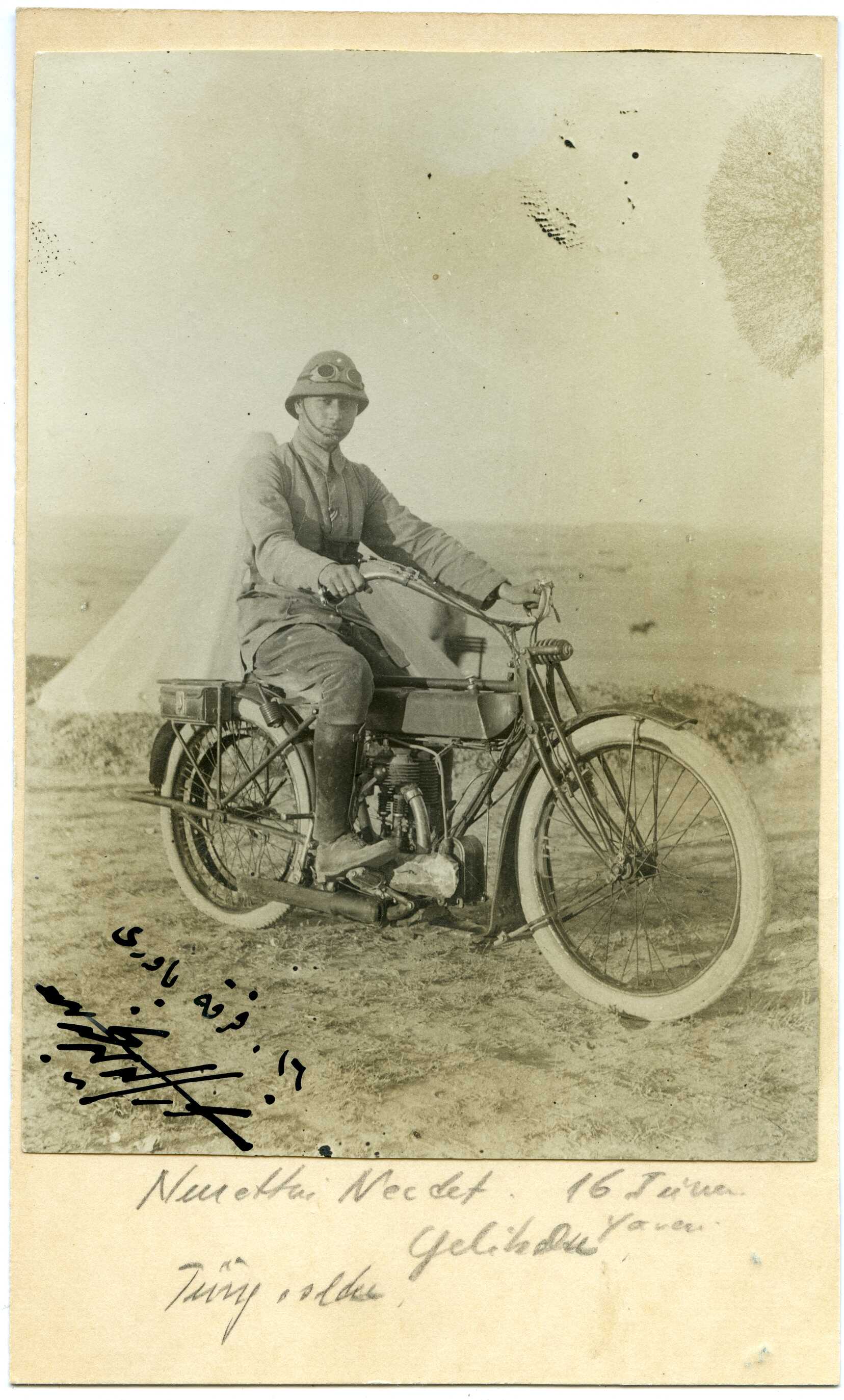 16. Fırka Yaveri Nureddin Necdet çölde, II. Gazze Muharebeleri'nde İngilizler'den ele geçirilen bir motosikletin üstünde
